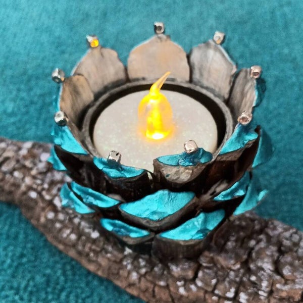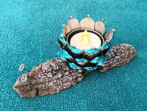 Escargot réalisé en bois flotté, écailles de pommes de pin métallisées turquoise laquées; réceptacle de la bougie en plastique recyclé diamètre 4cm.