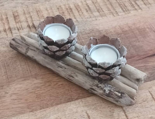 Réceptacles bougies en plastique recyclé, habillés d'écailles de pommes de pin. Diamètre: 4cm.