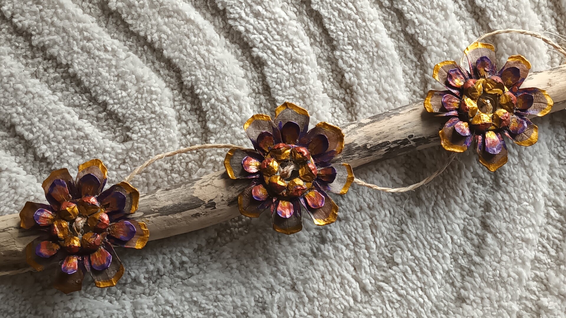 Bois flotté, écailles de pommes de pin.
