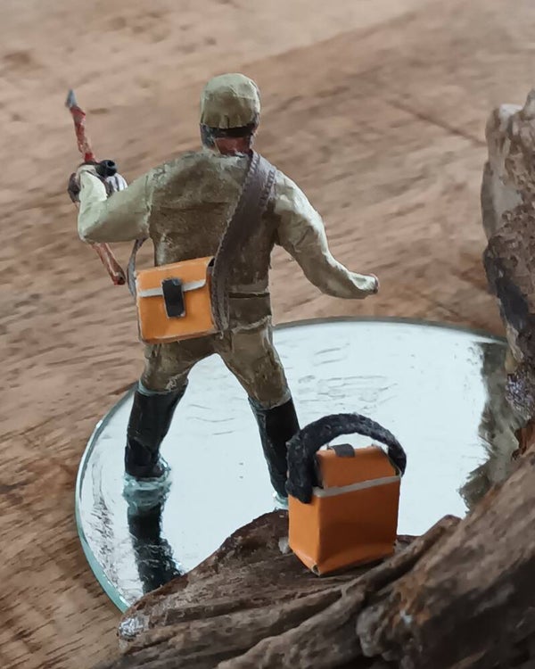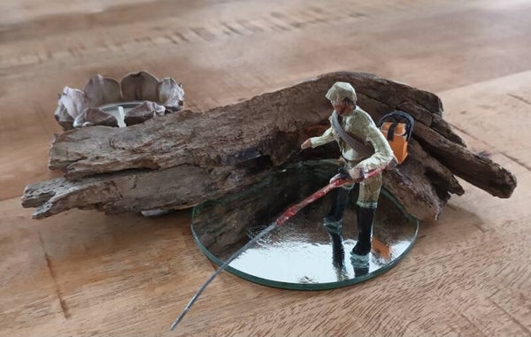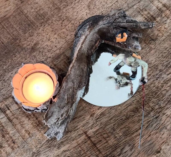 Composition en bois flotté, écailles de pommes de pin, personnage en fil de fer et papiers publicitaires; base en miroir rond de 14cm, réceptacle bougie en plastique recyclé, diamètre 4cm.