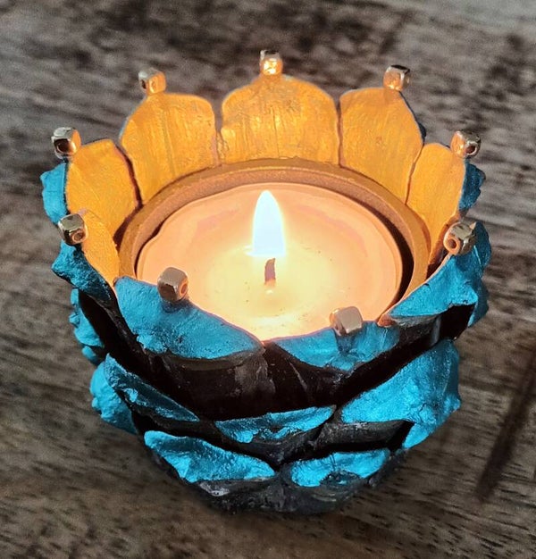 Réceptacle bougie en plastique recyclé, habillé d'écailles de pommes de pin couleurs métallisées vert turquoise et or. Perles carrées dorées.