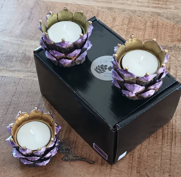 Réceptacle bougie en plastique recyclé, habillé d'écailles de pommes de pin couleurs métallisées mauve et or. Perles carrées dorées.