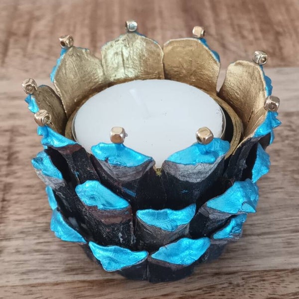 Réceptacle bougie en plastique recyclé, habillé d'écailles de pommes de pin couleurs métallisées bleu turquoise et or. Perles carrées dorées.