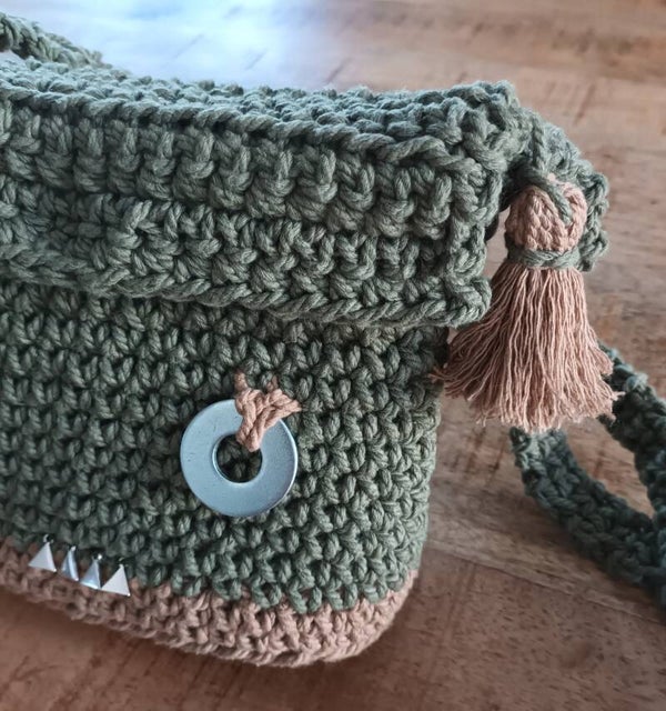 Sac crocheté, rigide, en coton recyclé kaki et beige.