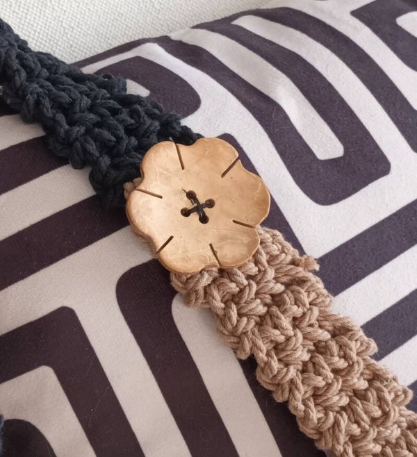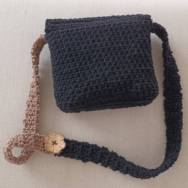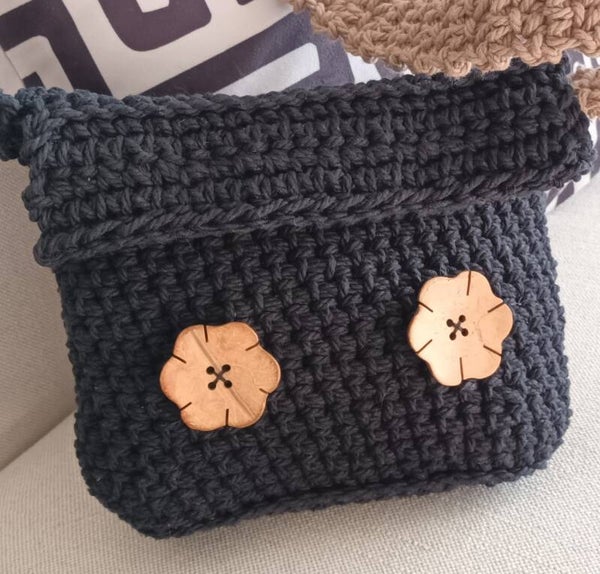 Sac crocheté, rigide, en coton recyclé noir et beige.