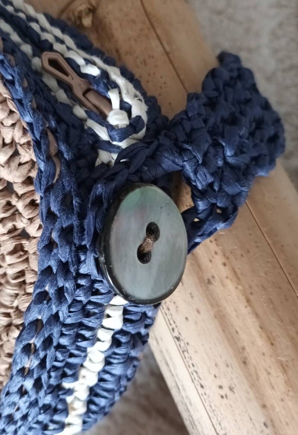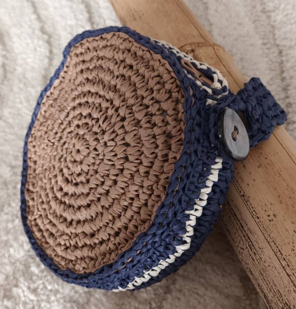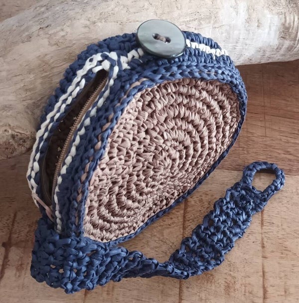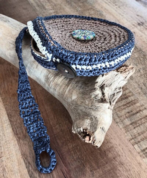 100% fibre de bois crochetée. Diamètre du sac 13,5cm, couleur taupe. Epaisseur du pourtour 3,5cm, couleur bleu jeans et bande centrale écrue.
