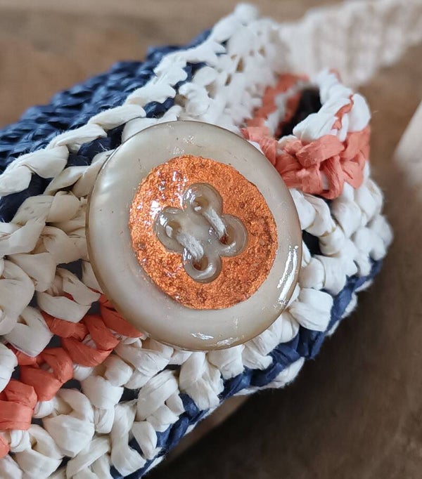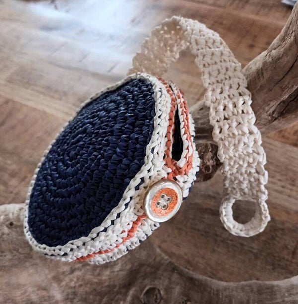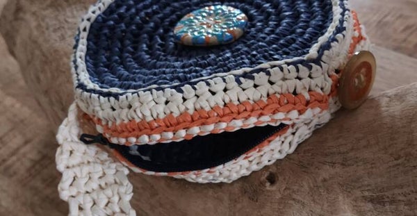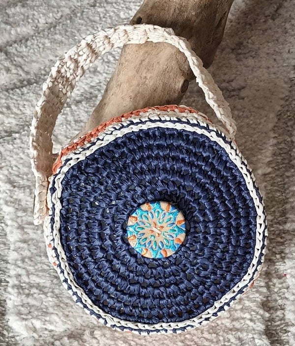 100% fibre de bois crochetée. Diamètre du sac 13,5cm, couleur bleu jeans . Epaisseur du pourtour 3,5cm, couleur écru et bande centrale mandarine.