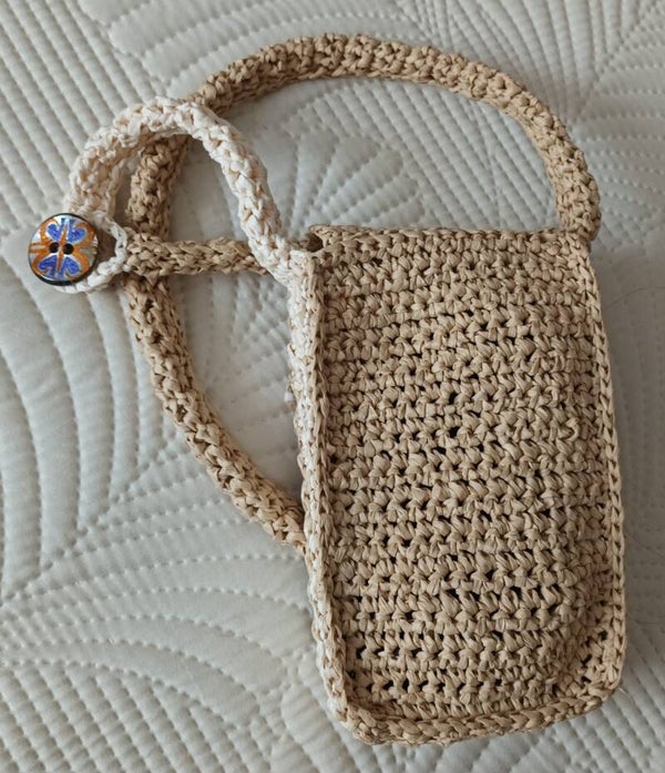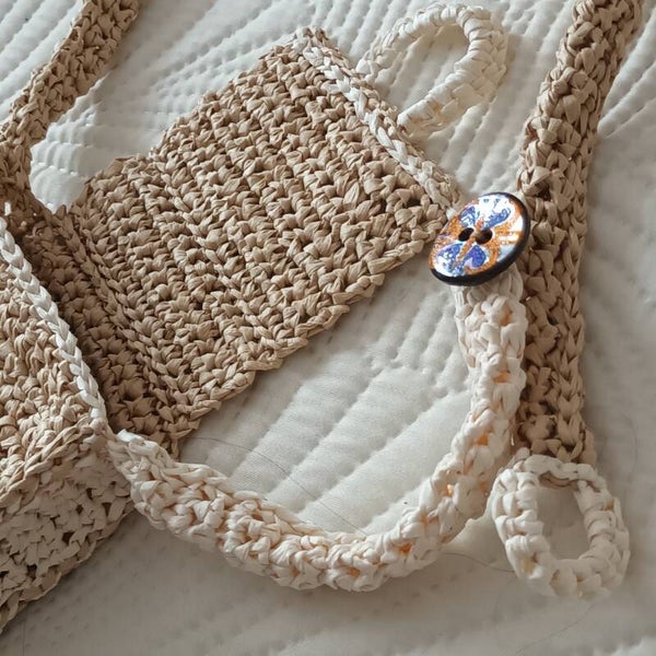 100% fibre de bois crochetée 2 tons, naturel et écru. Dimensions 18x11x3,5cm .