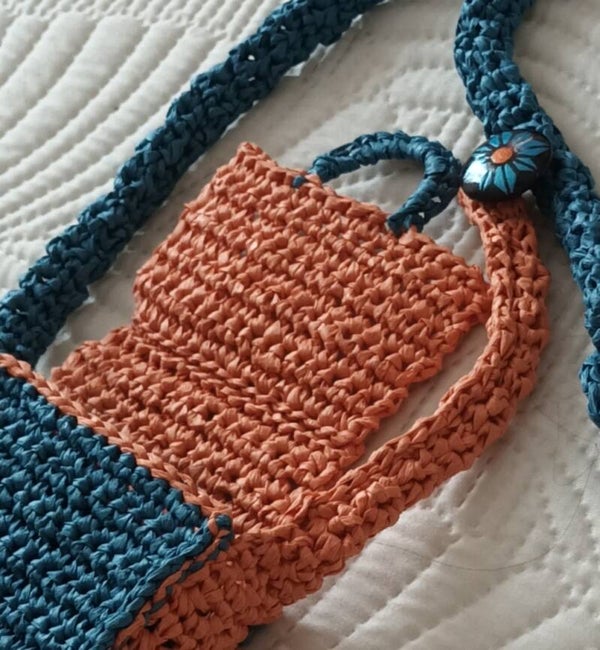 100% fibre de bois crochetée 2 tons, pétrole et mandarine. Dimensions 18x11x3,5cm .