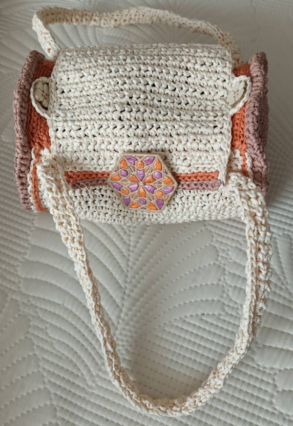 Sac polochon "WOOD'IS" écru mandarine et vieux rose lg.20cm ¤14