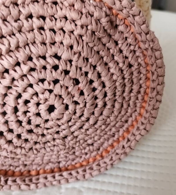 100% fibre de bois crochetée 3 tons, écru, mandarine et vieux rose. Dimensions 20x14cm de diamète. Bords roulottés.
