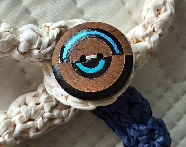 Bandoulière tubulaire de 2 tons, longueur épaule 52cm, décorée d'un bouton en bois customisé et laqué. Peut s'ouvrir pour s'accrocher n'importe où.