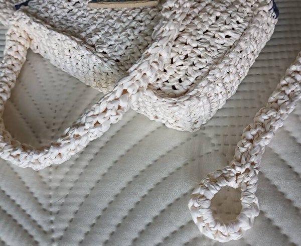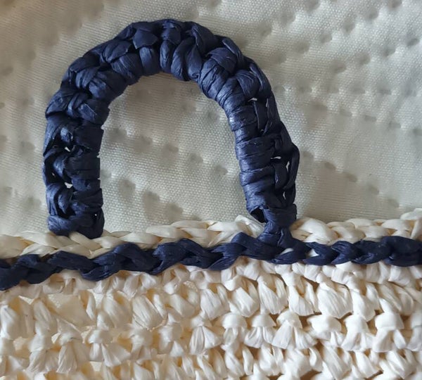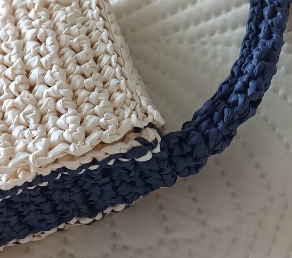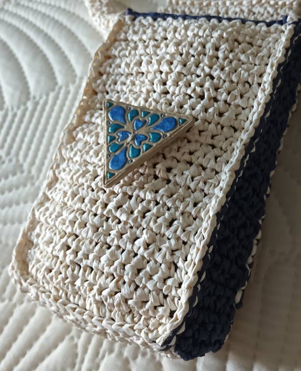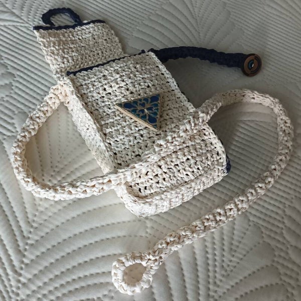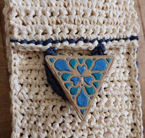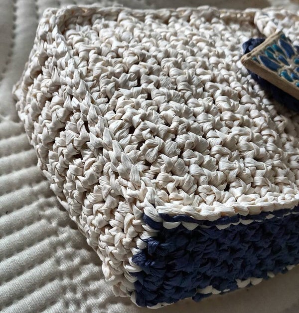 100% fibre de bois crochetée 2 tons, écru et bleu jeans. Dimensions 18x11x3,5cm .