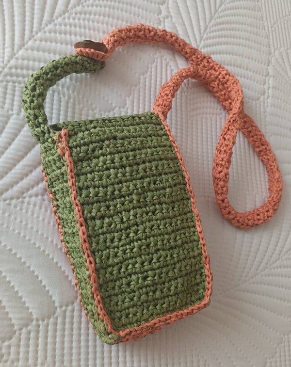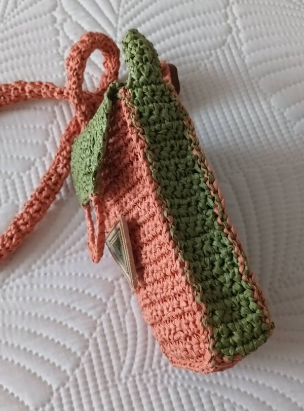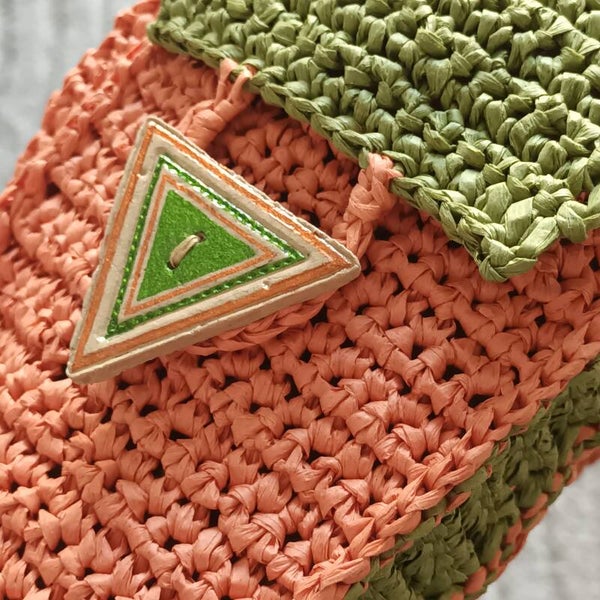 100% fibre de bois crochetée 2 tons, mandarine et vert nature. Dimensions 18x11x3,5cm .