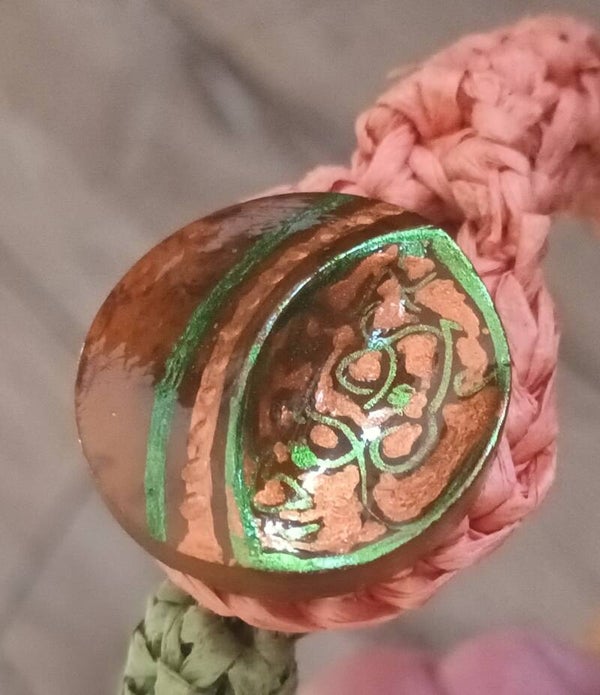 Bandoulière tubulaire de 2 tons, longueur épaule 52cm, décorée d'un bouton vintage customisé et laqué. Peut s'ouvrir pour s'accrocher n'importe où.
