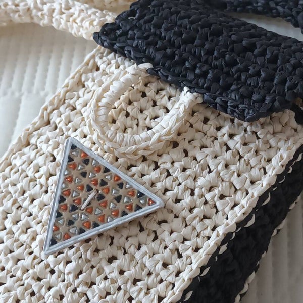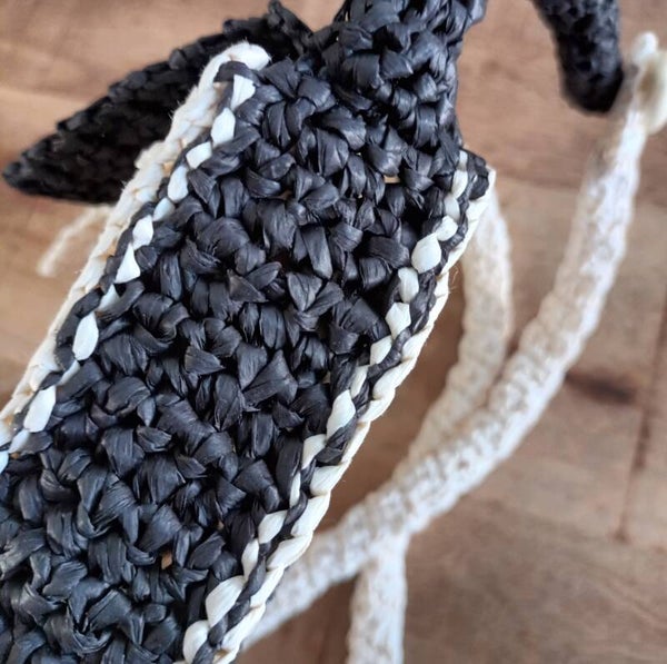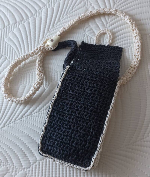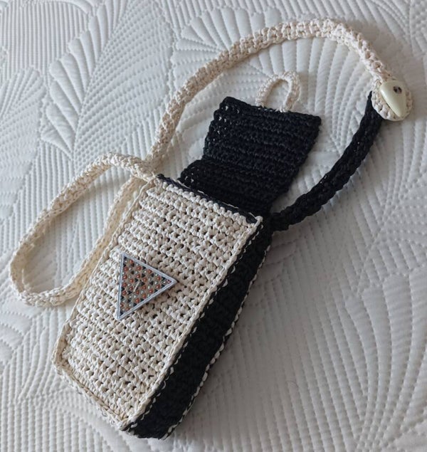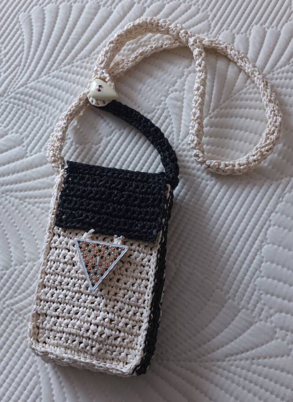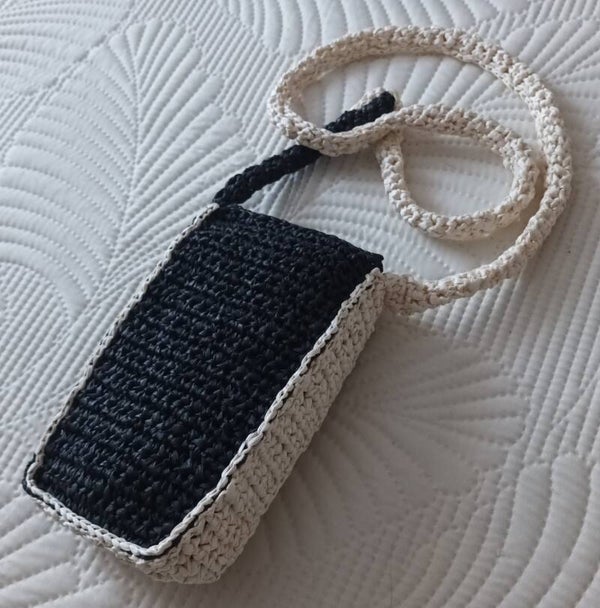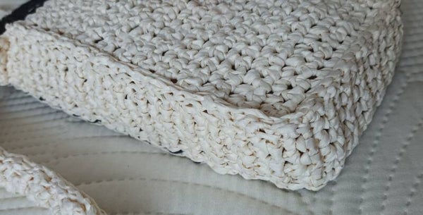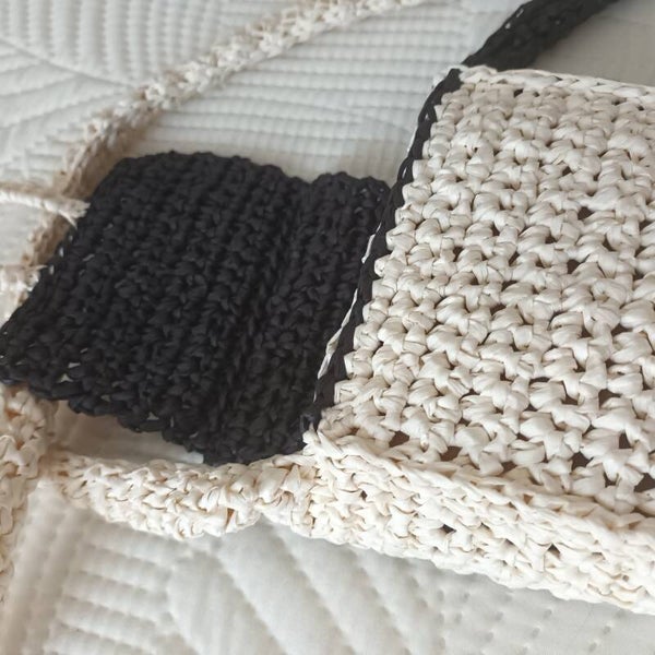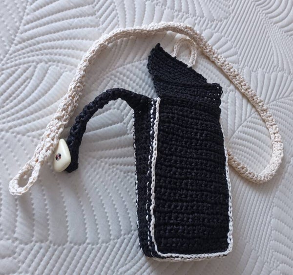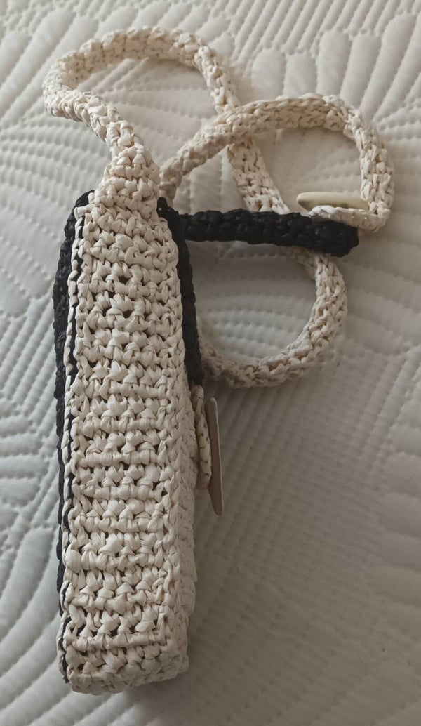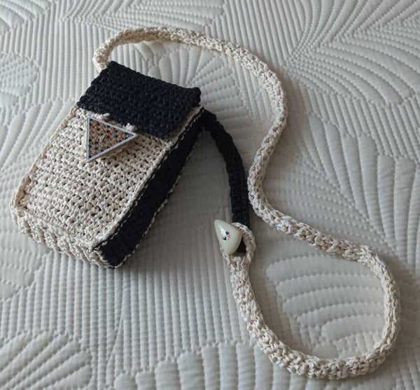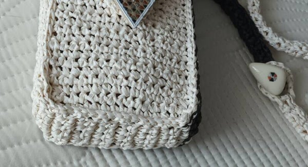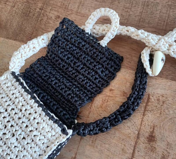 100% fibre de bois crochetée 2 tons, écru et noir. Dimensions 18x11x3,5cm .