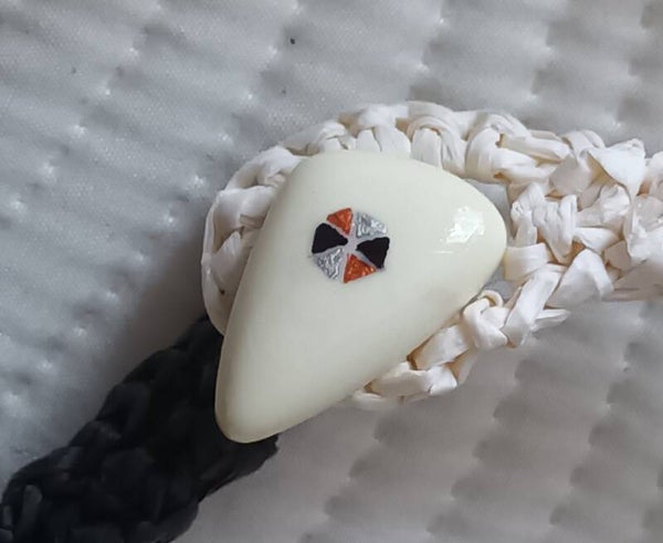 Bandoulière tubulaire de 2 tons, longueur épaule 52cm, décorée d'un bouton vintage customisé et laqué. Peut s'ouvrir pour s'accrocher n'importe où.