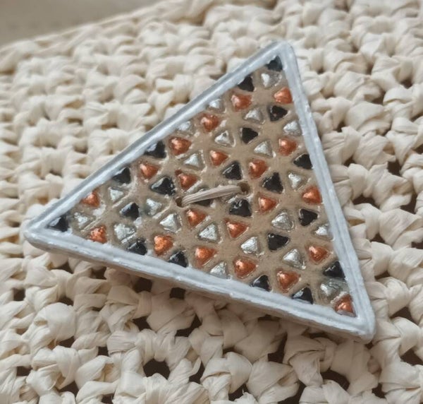 Décoration triangulaire, en pâte à base d'eau et de fibre de bois laquée, réalisée manuellement. Sert de bouton pour fermeture à rabat.