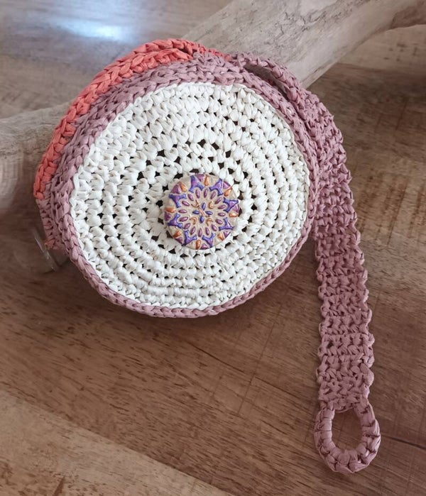 100% fibre de bois crochetée. Diamètre du sac 13,5cm, couleur écru. Epaisseur du pourtour 3,5cm, couleur vieux rose et bande centrale mandarine.