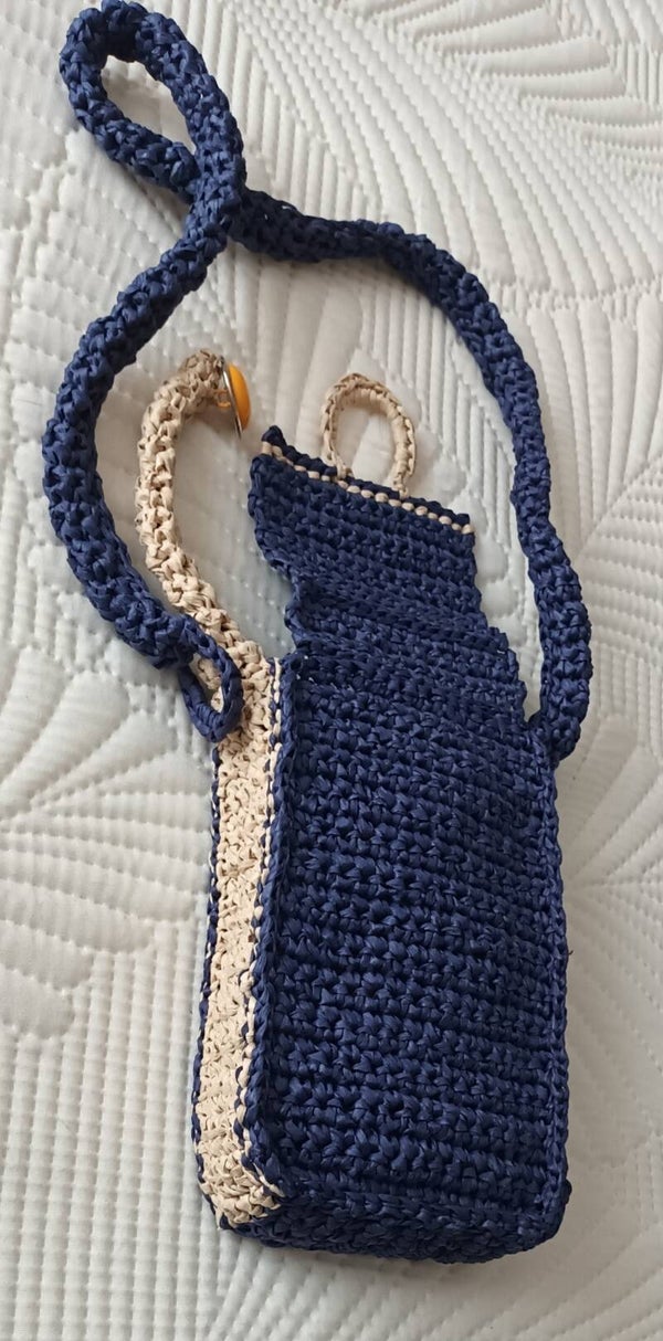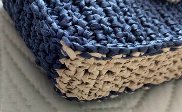100% fibre de bois crochetée 2 tons, bleu jeans et naturel. Dimensions 18x11x3,5cm .