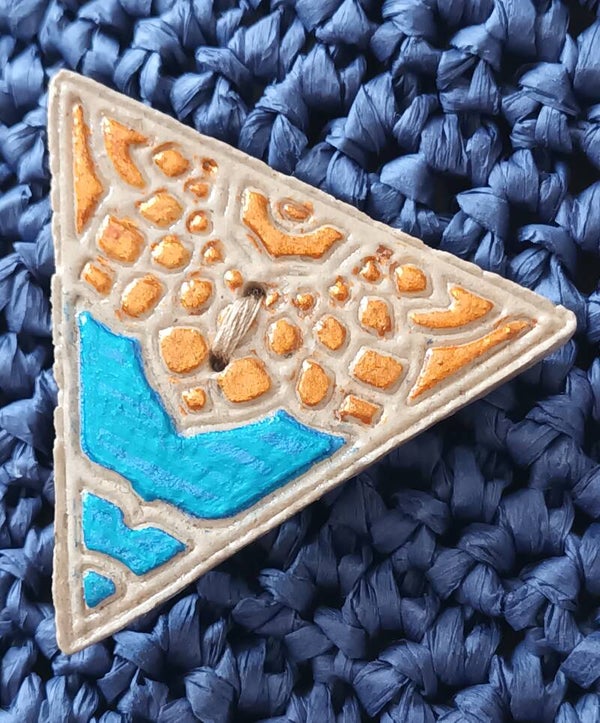 Décoration triangulaire, en pâte à base d'eau et de fibre de bois laquée, réalisée manuellement. Sert de bouton pour fermeture à rabat.