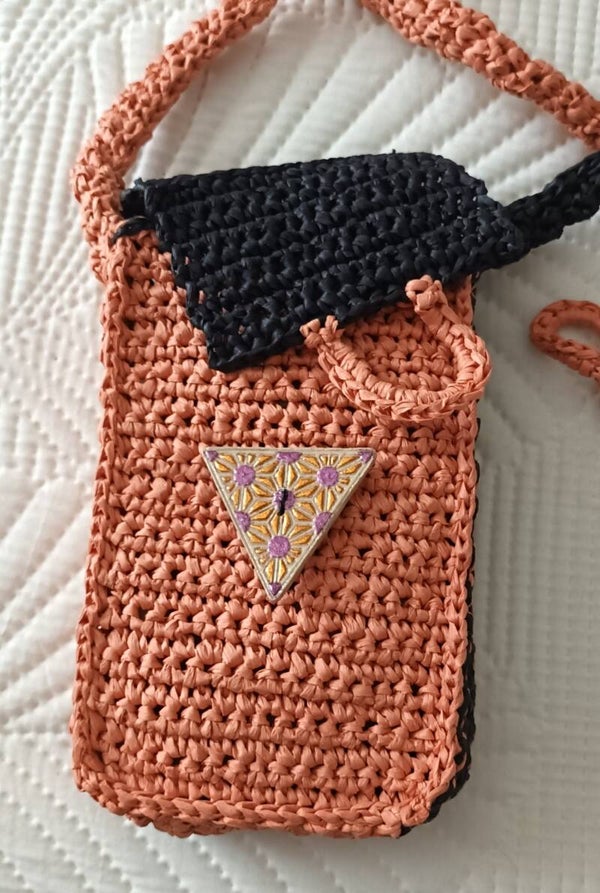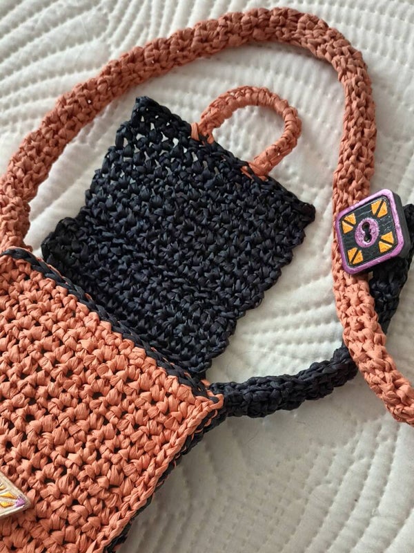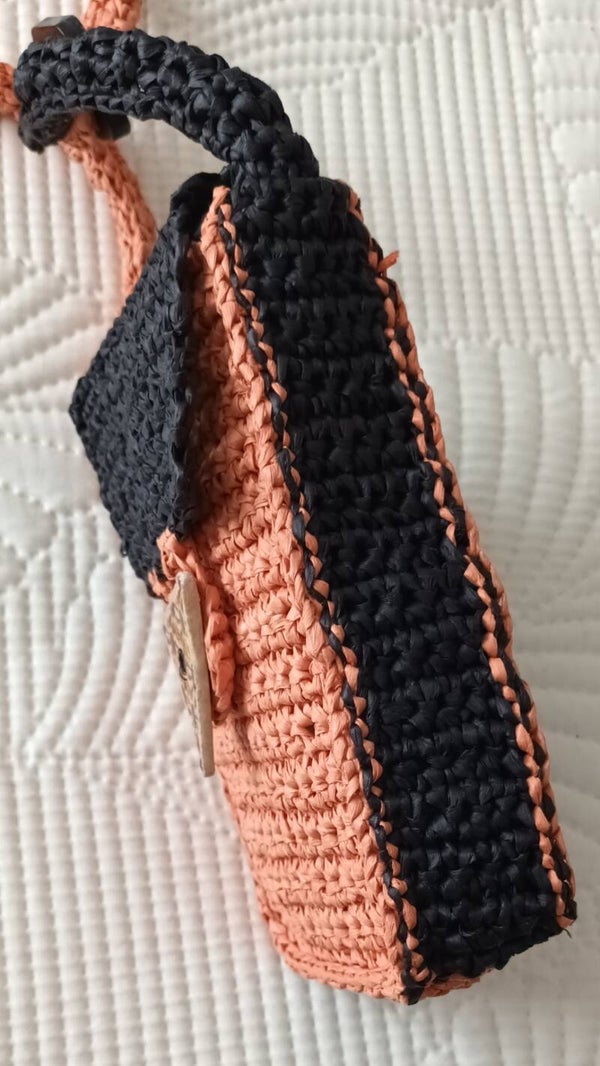 100% fibre de bois crochetée 2 tons, mandarine et noir. Dimensions 18x11x3,5cm .