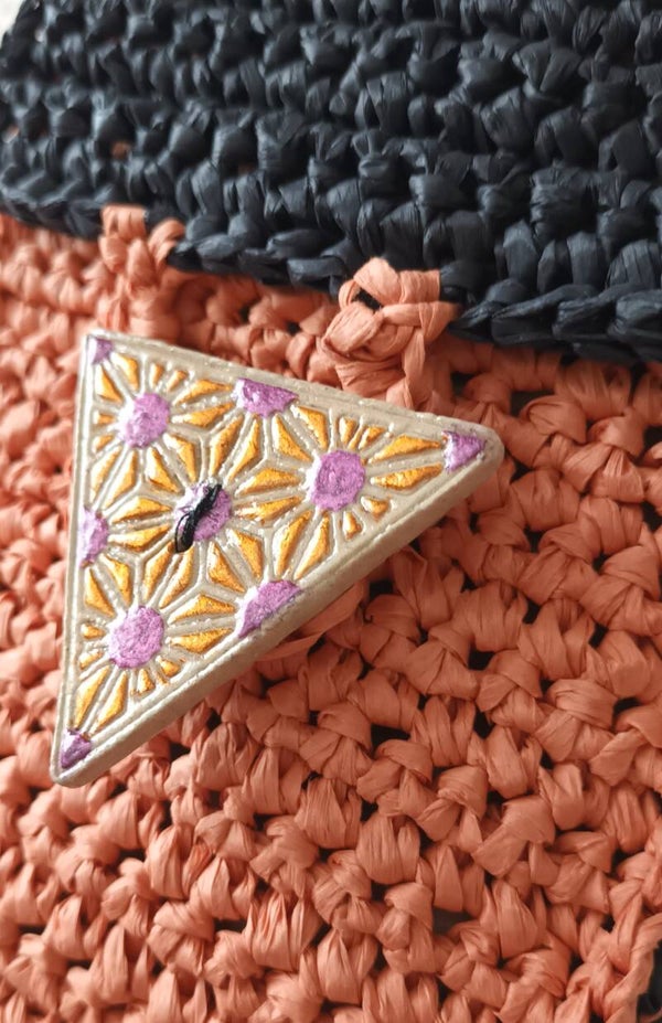 Décoration triangulaire, en pâte à base d'eau et de fibre de bois laquée, réalisée manuellement. Sert de bouton pour fermeture à rabat.