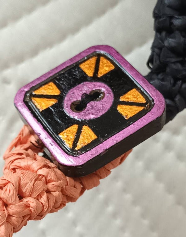 Bandoulière tubulaire de 2 tons, longueur épaule 52cm, décorée d'un bouton vintage customisé et laqué. Peut s'ouvrir pour s'accrocher n'importe où.