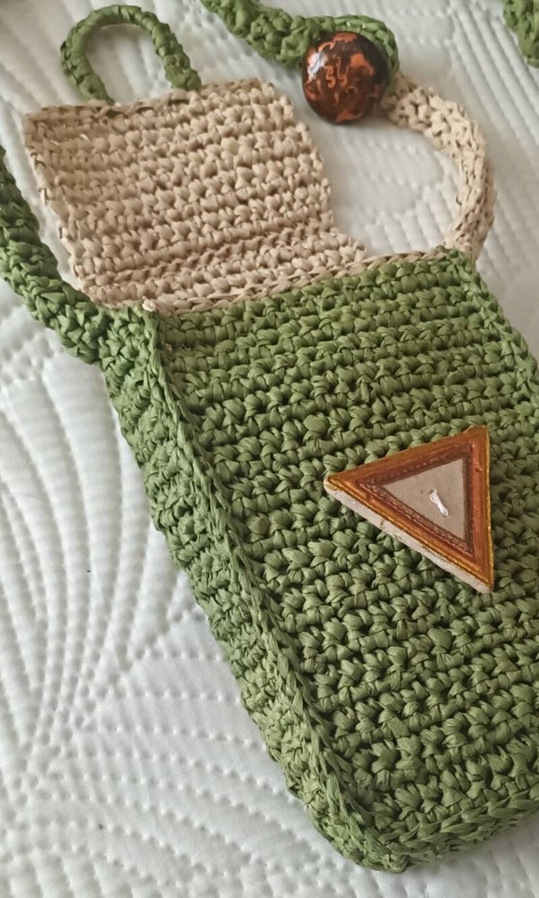 100% fibre de bois crochetée 2 tons, vert nature et naturel. Dimensions 18x11x3,5cm .