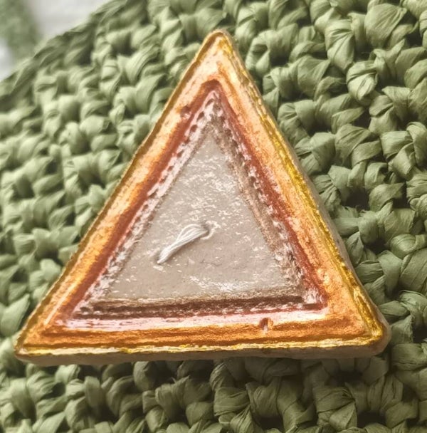 Décoration triangulaire, en pâte à base d'eau et de fibre de bois laquée, réalisée manuellement. Sert de bouton pour fermeture à rabat.