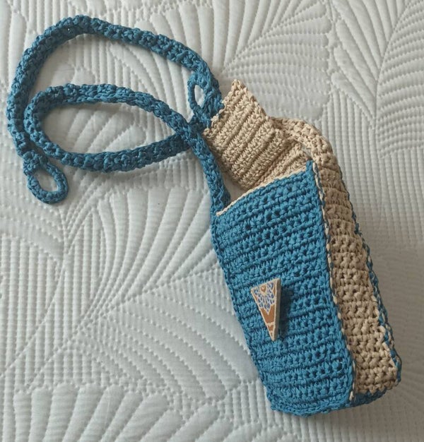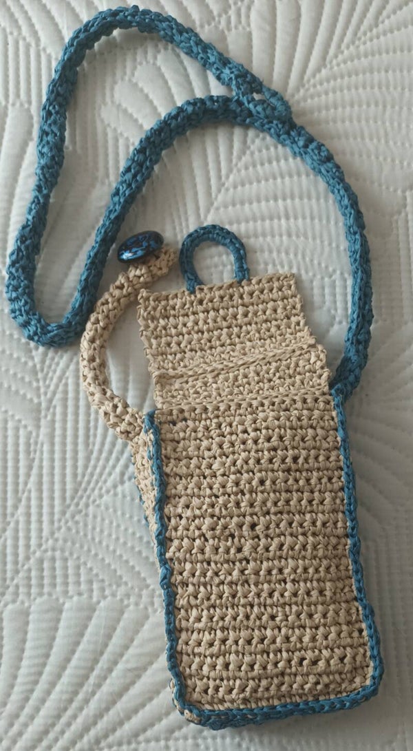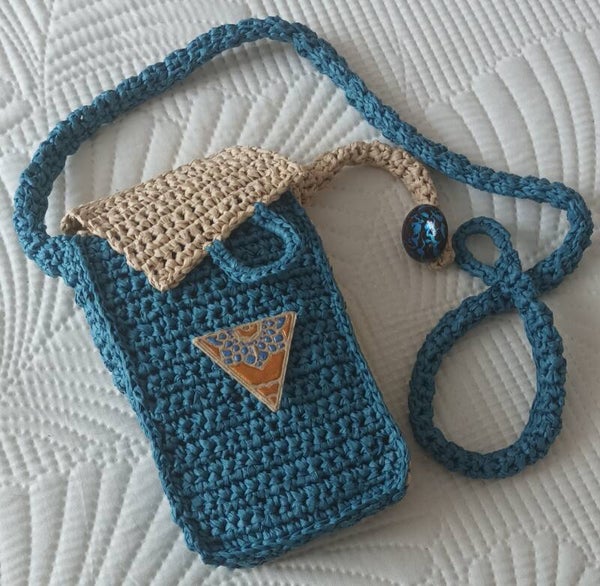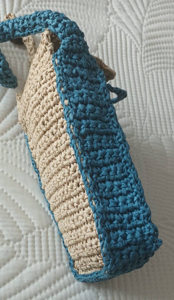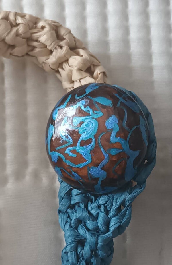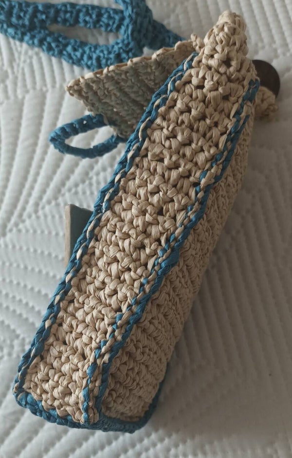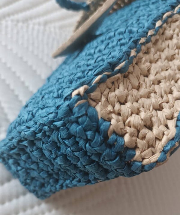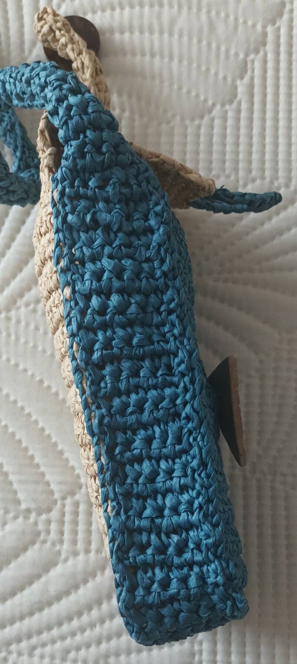 100% fibre de bois crochetée 2 tons, pétrole et naturel. Dimensions 18x11x3,5cm .