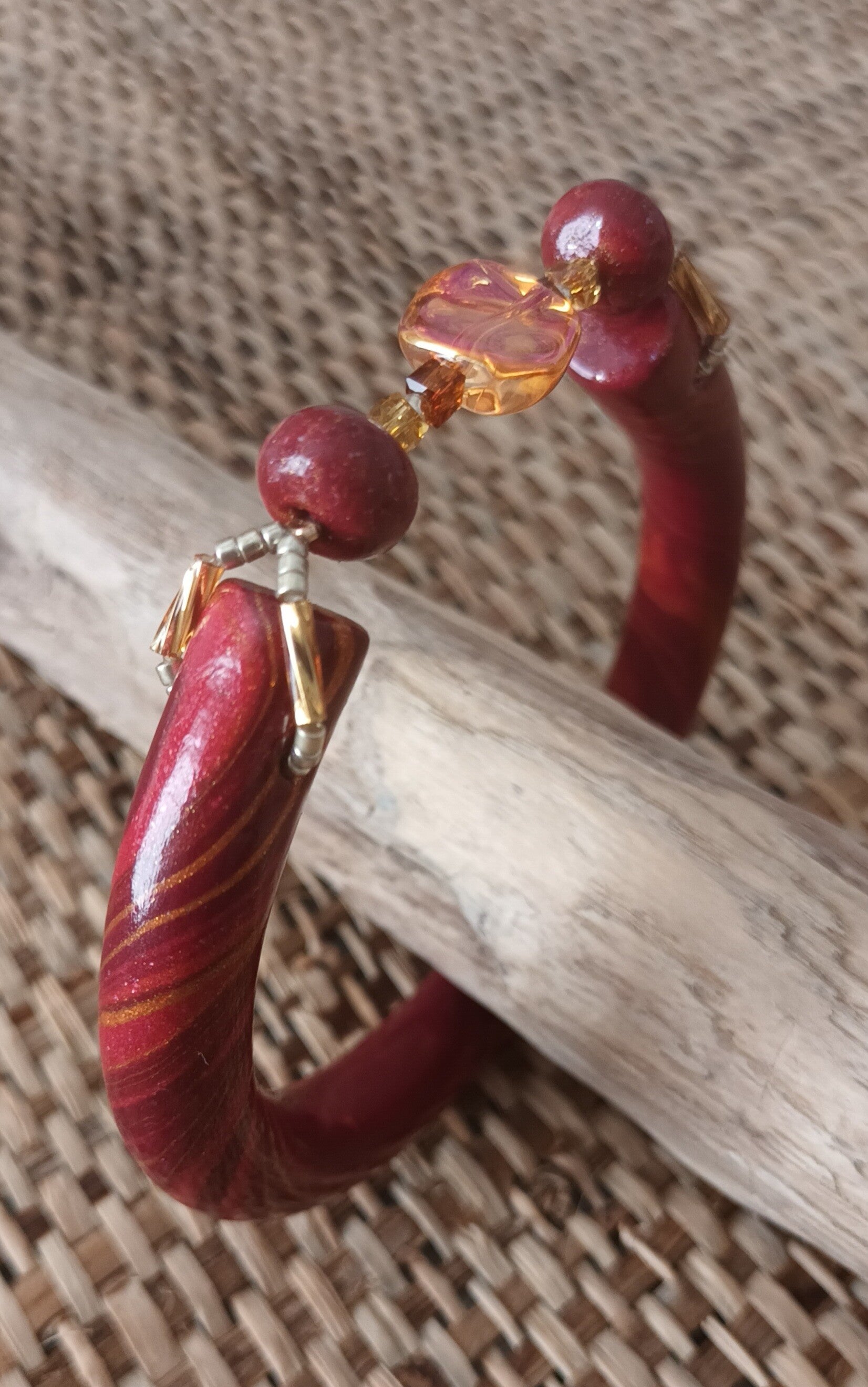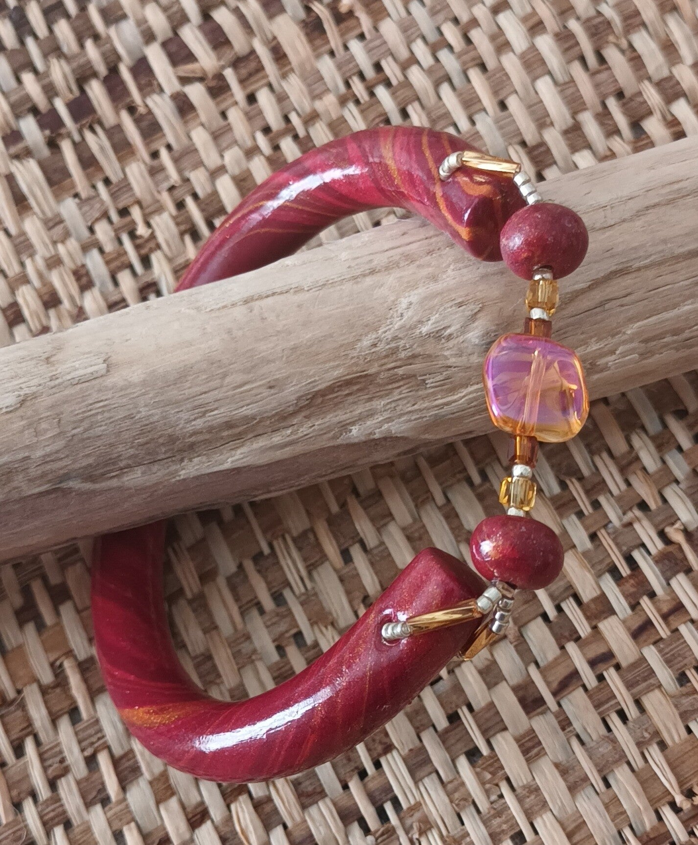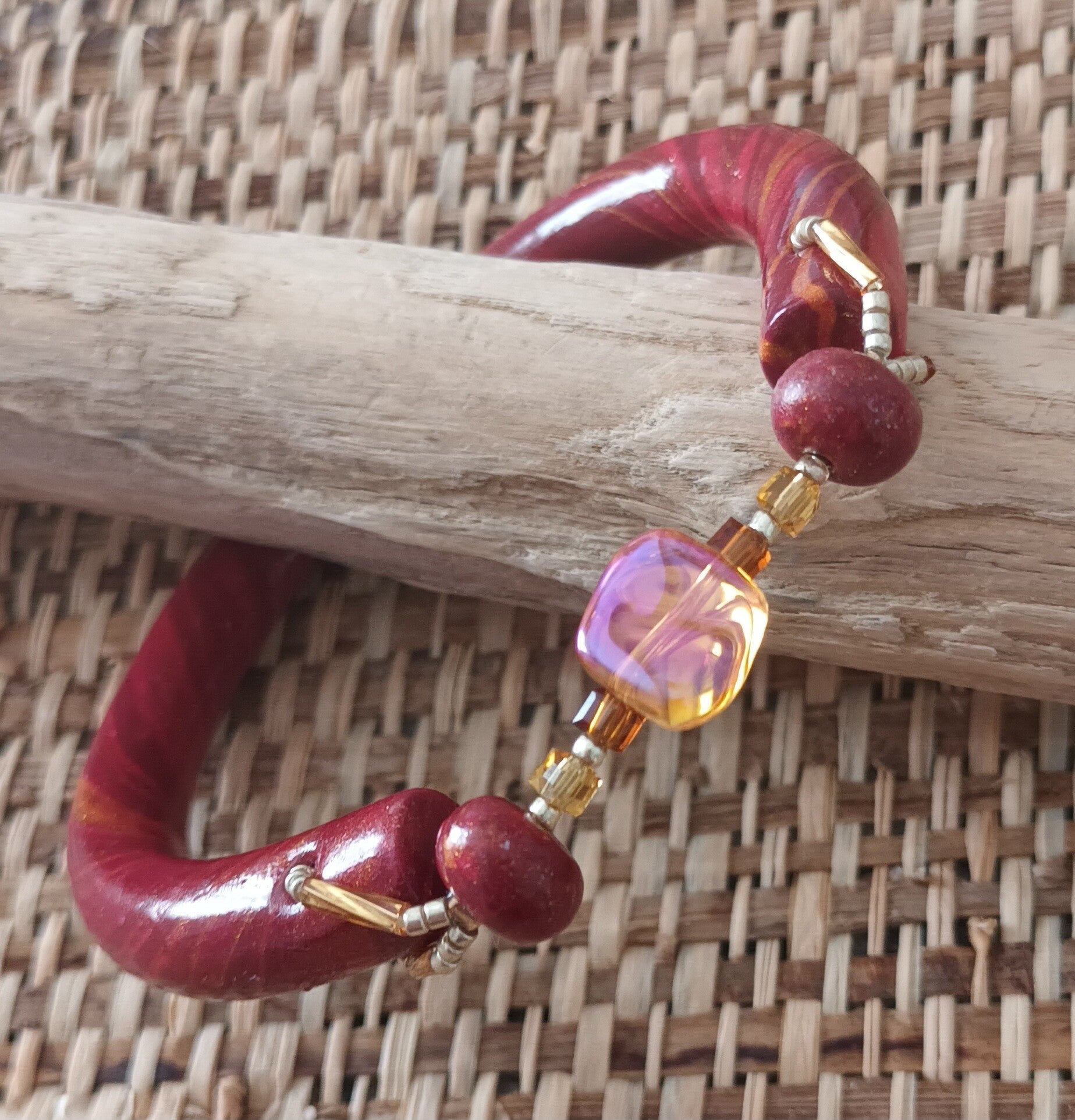 Jonc 9mn et grosses perles en polymère modelés à la main, surface laquée, poisson perle en verre tons dégradés orange et turquoise translucide, perles de verre et de rocaille.