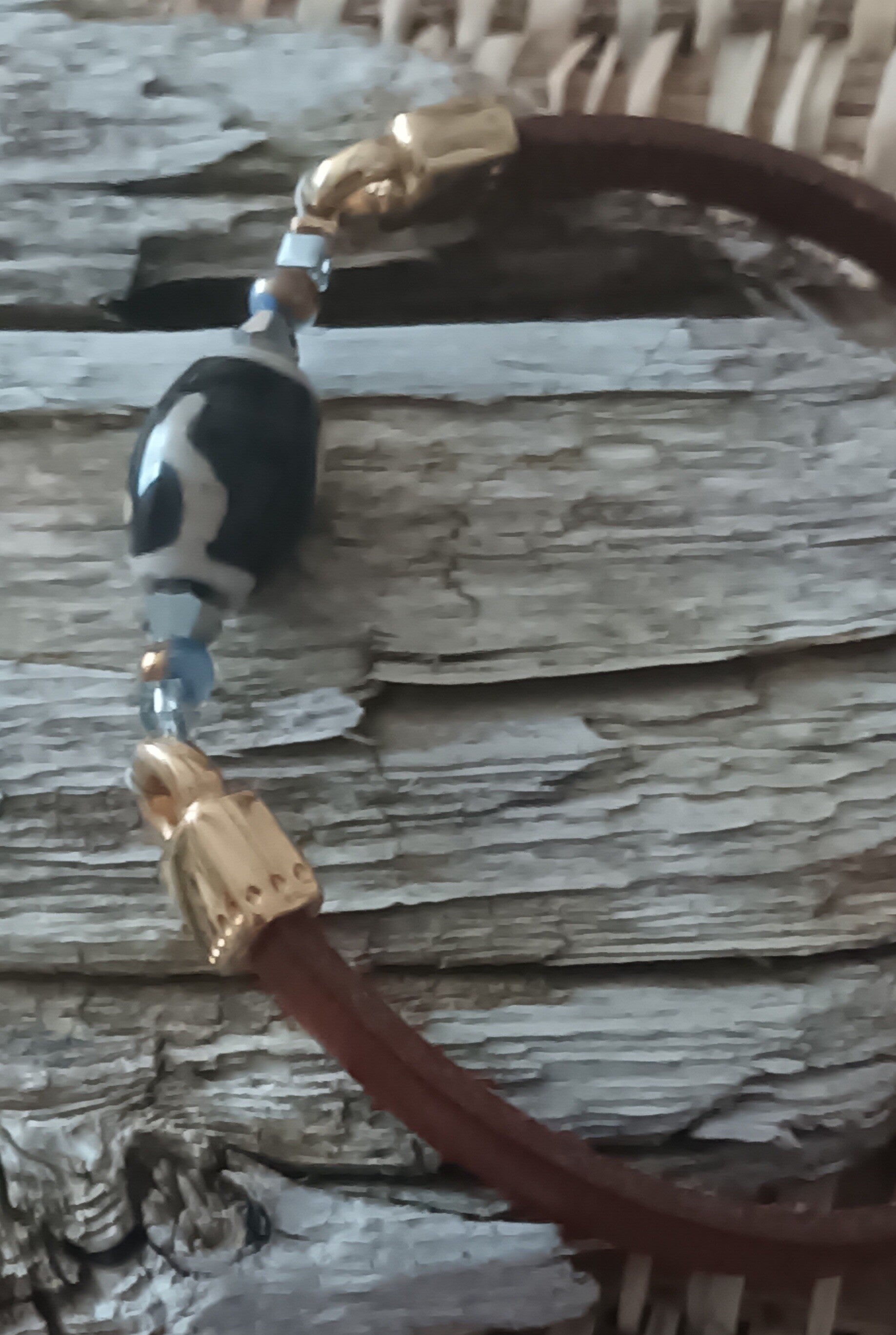 Bracelet cuir plat italien 5mn couleur camel, entraxe orné d'une agate Thibétaine à facette noire et écru de 8mn et de perles de verre.
