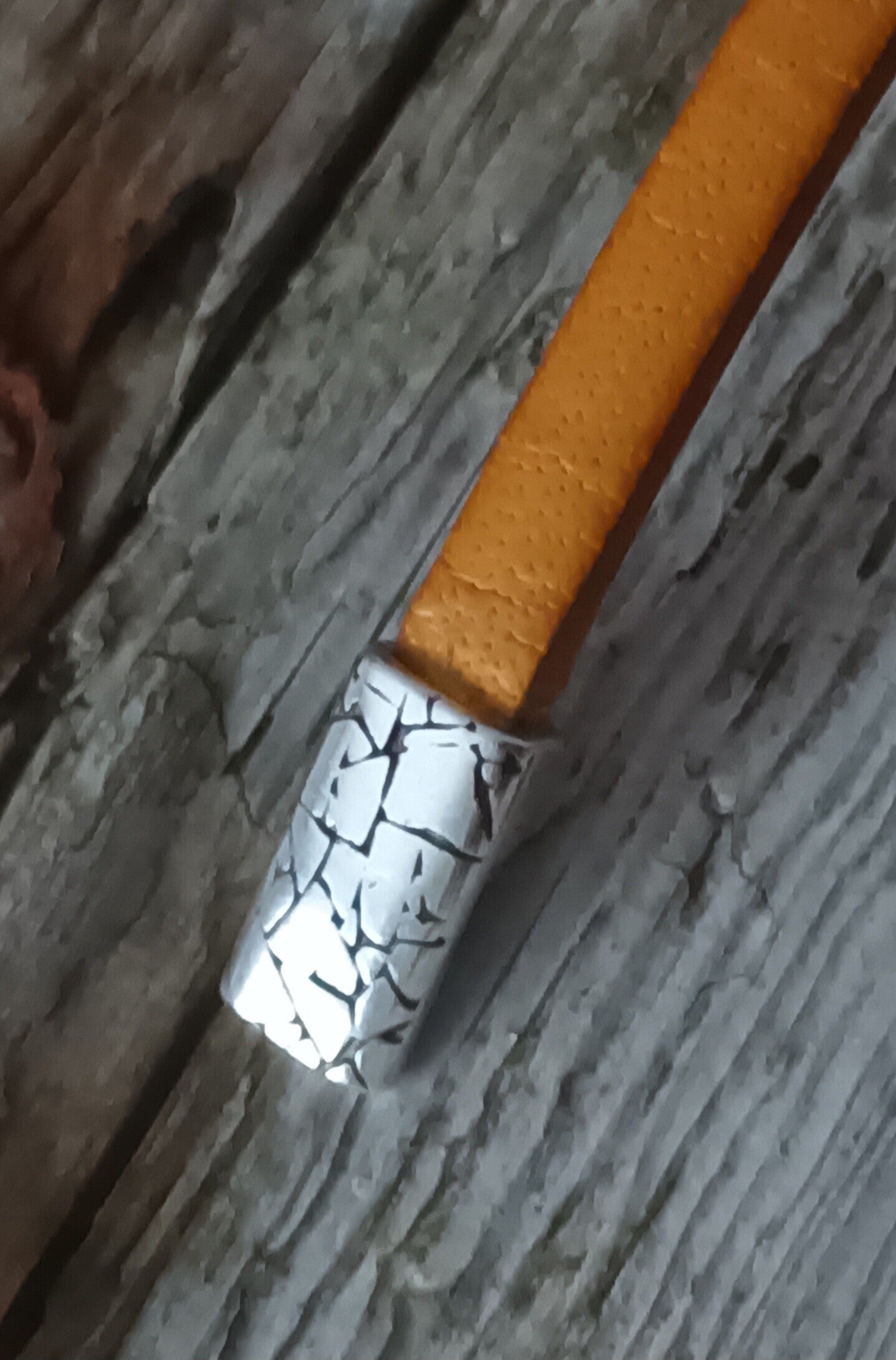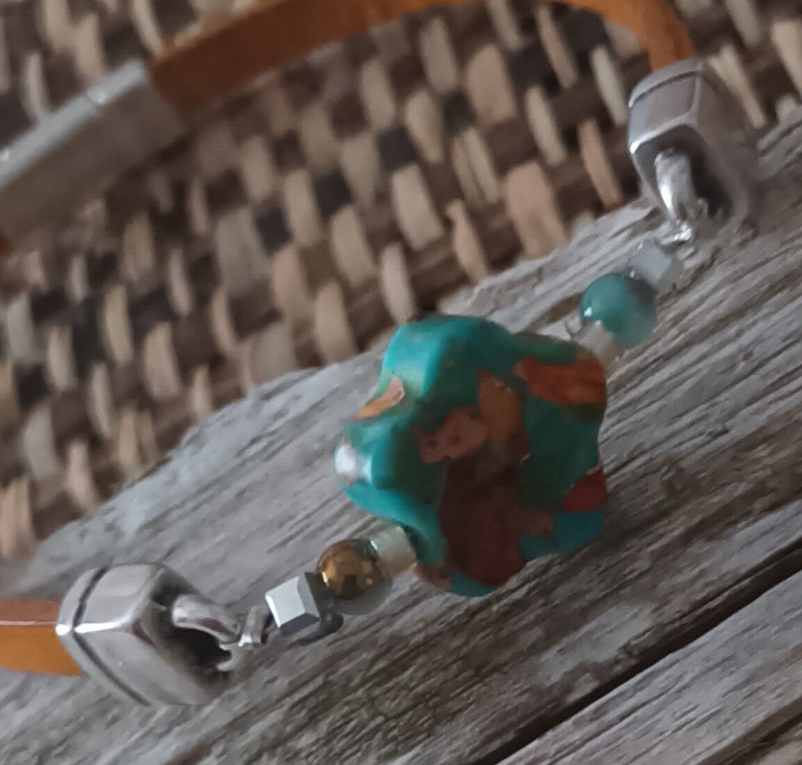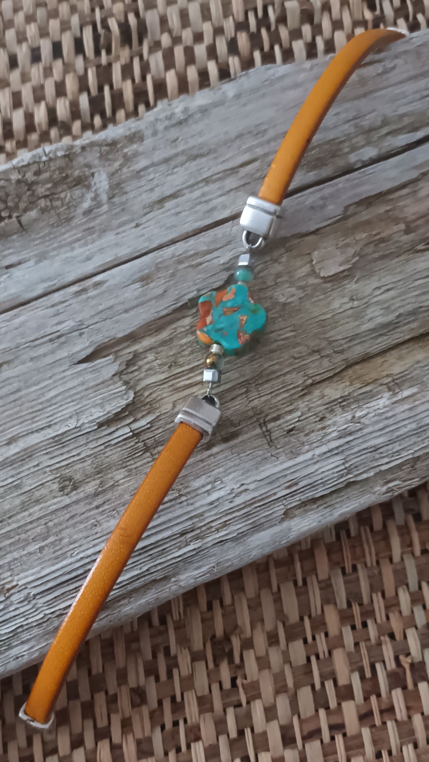 Bracelet cuir plat itallien 5mn couleur safran, entraxe orné d'une fleur en régalite de 8mn et de perles de verre.