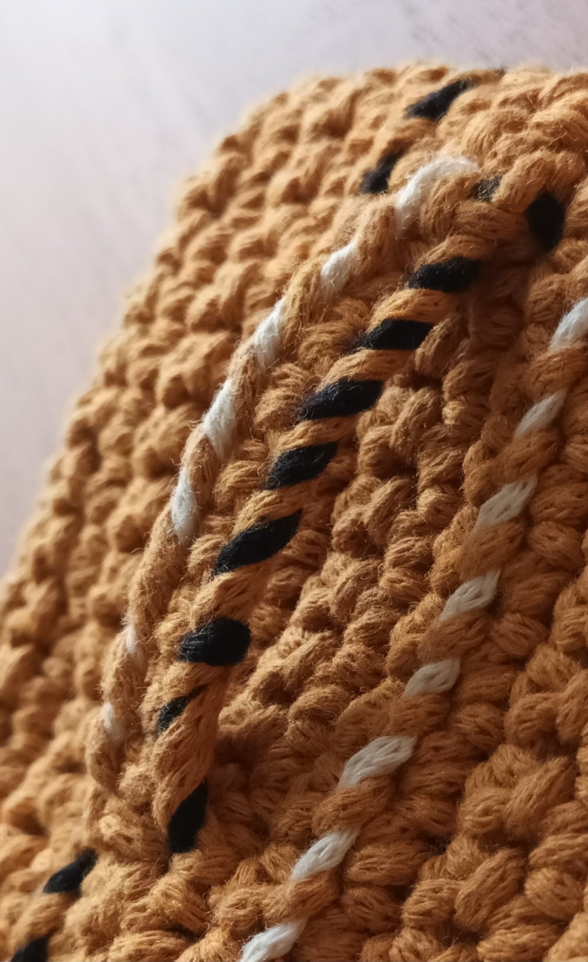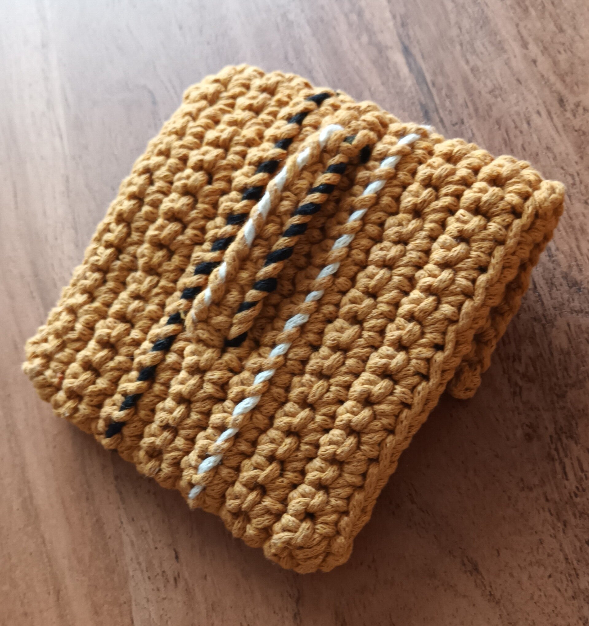 Pochon crocheté main, 80% coton recyclé 20%polyester, safran. Passements décoratifs 2 tons écru et noir.
