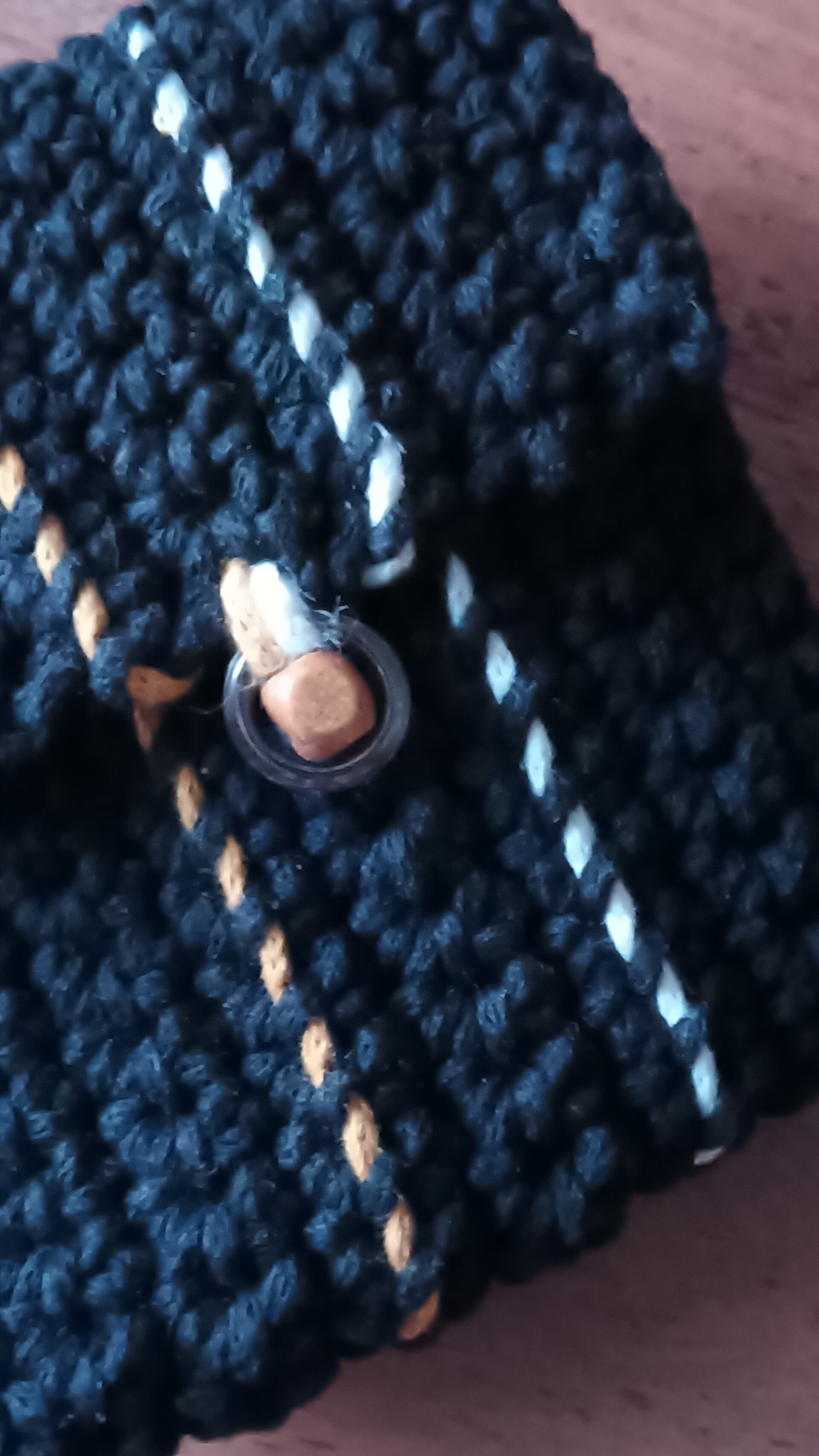 Pochon crocheté main, 80% coton recyclé 20%polyester, noire. Passements décoratifs 2 tons safran et écru.