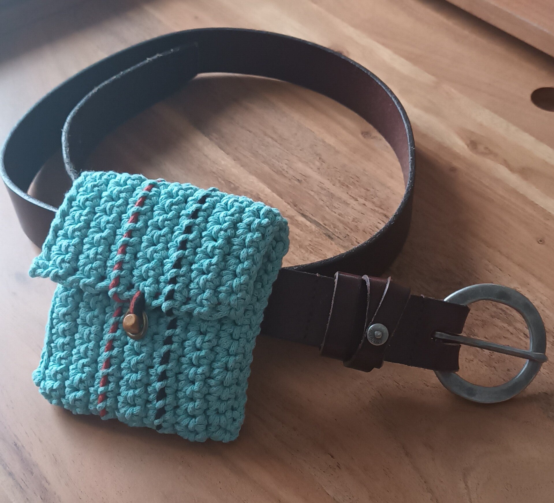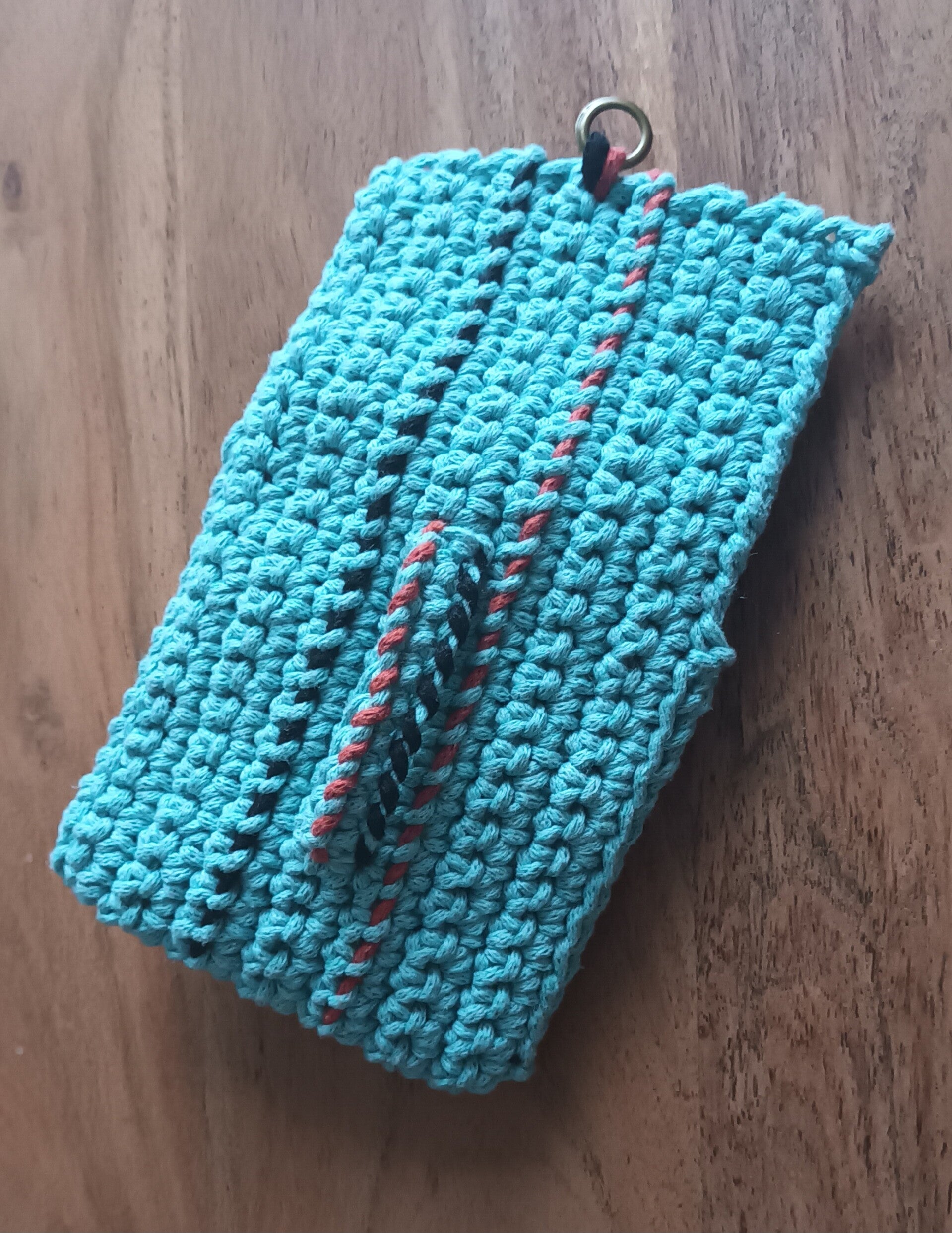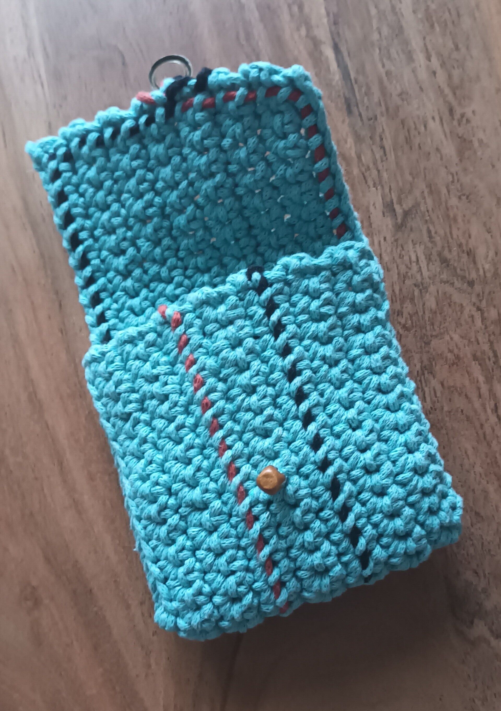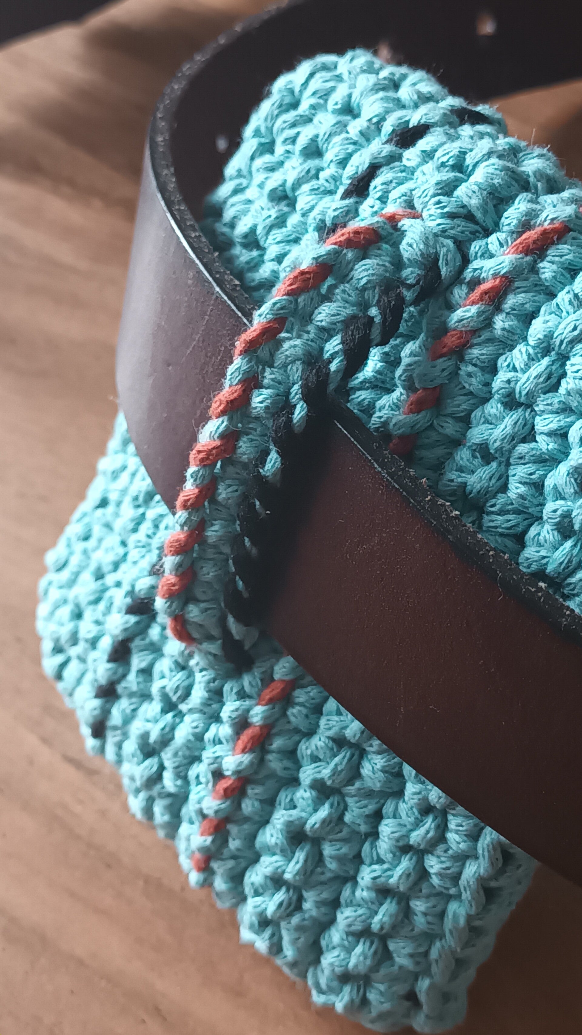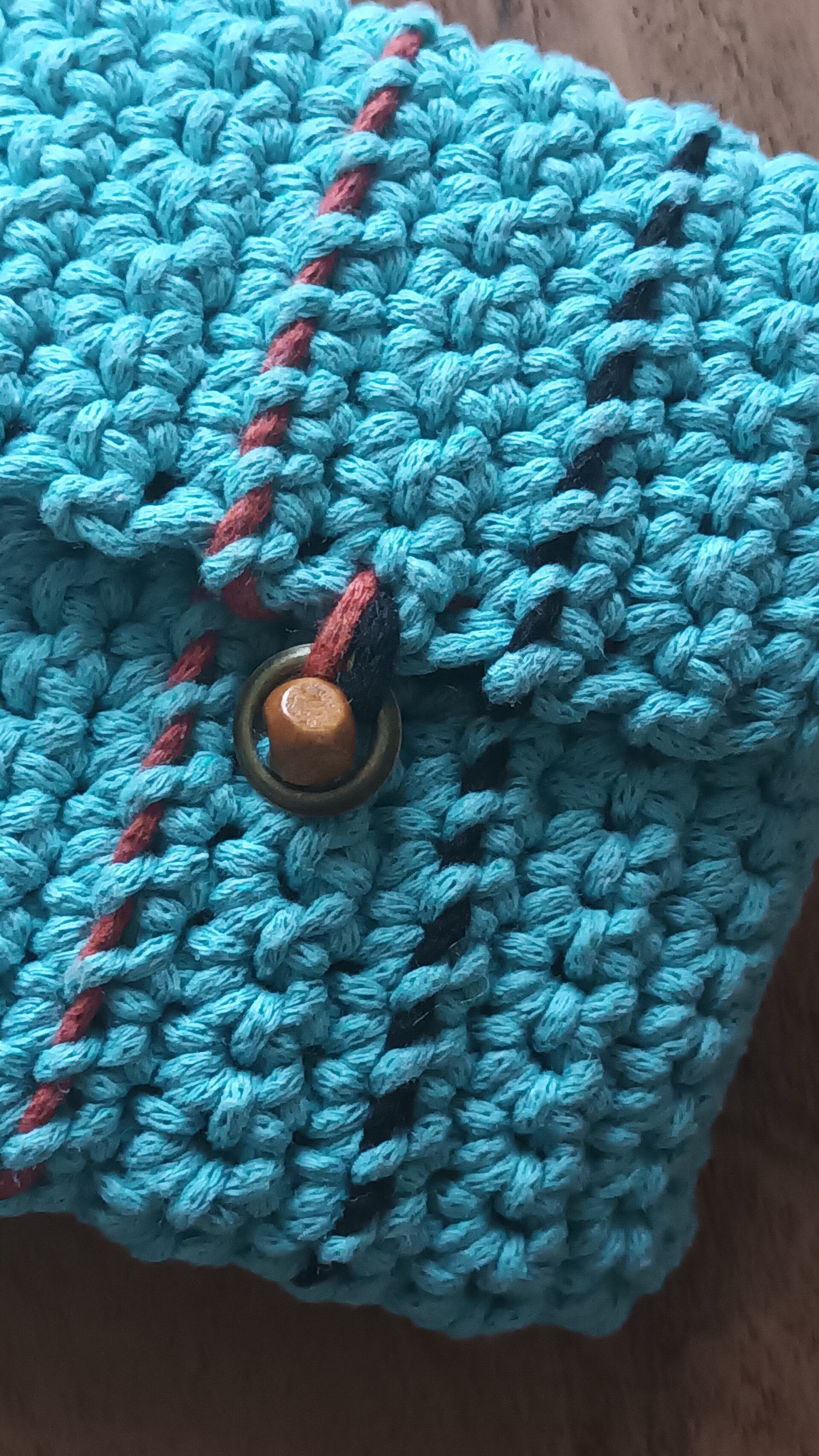 Pochon crocheté main, 80% coton recyclé 20%polyester, jade. Passements décoratifs 2 tons rouge brique et noir.