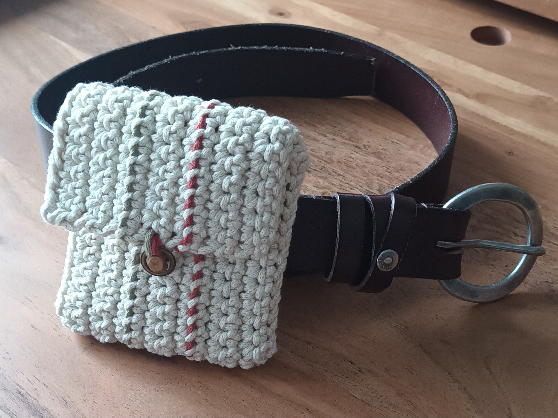 Pochon crocheté main, 80% coton recyclé 20%polyester, écru. Passements décoratifs 2 tons kaki et rouge brique.