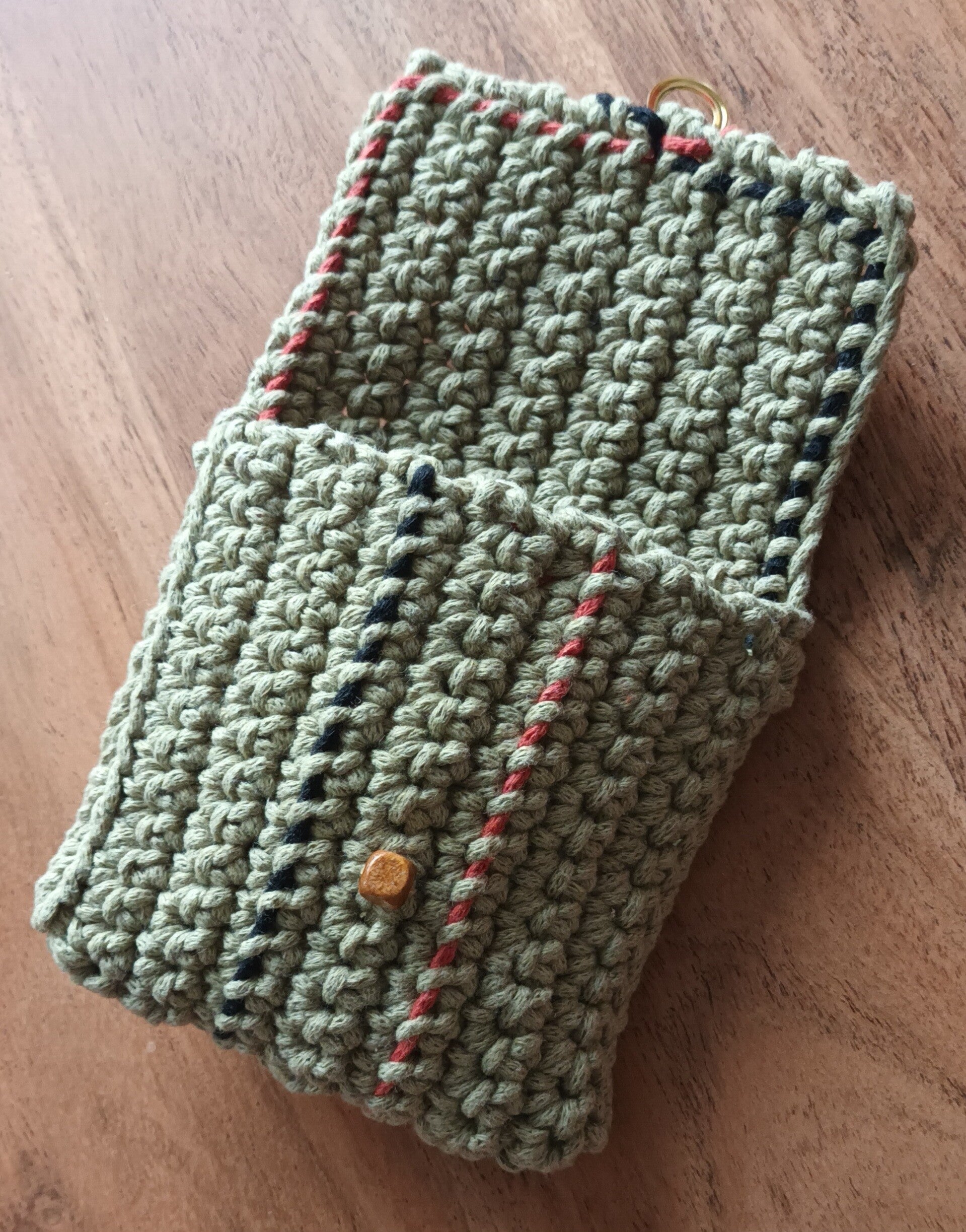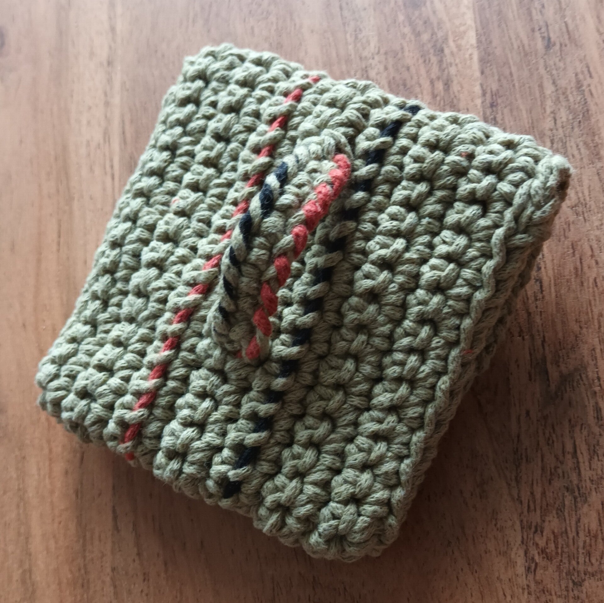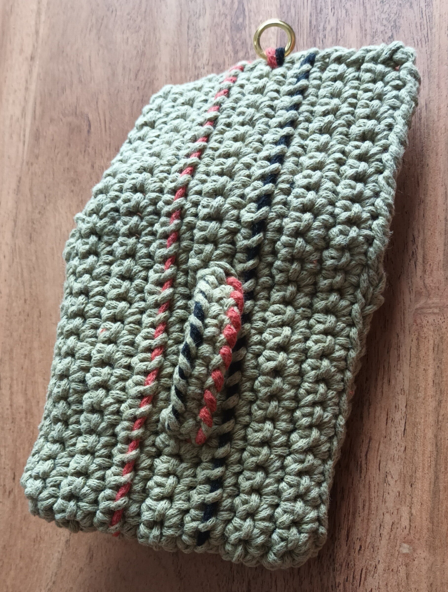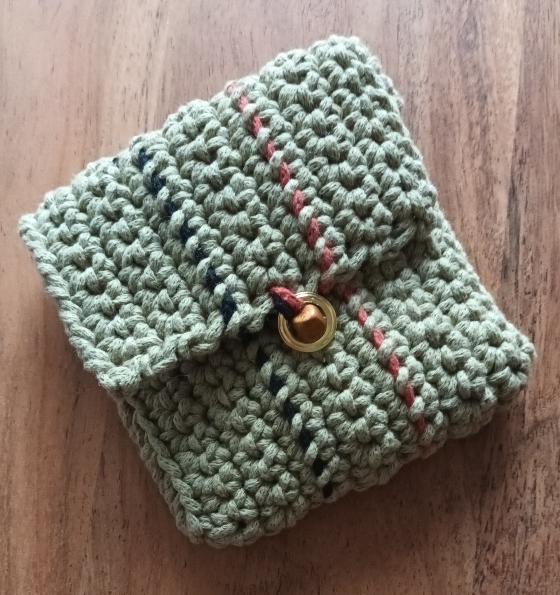 Pochon crocheté main, 80% coton recyclé 20%polyester, kaki. Passements décoratifs 2 tons écru et noir.
