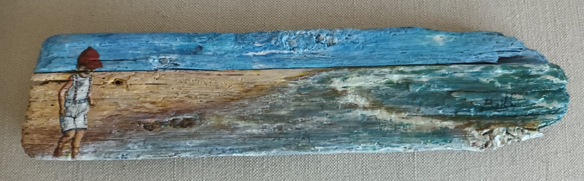 Peinture sur bois flotté "L'insouciance" 42x10cm