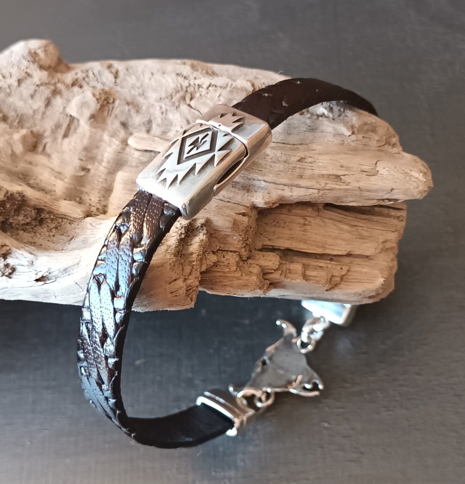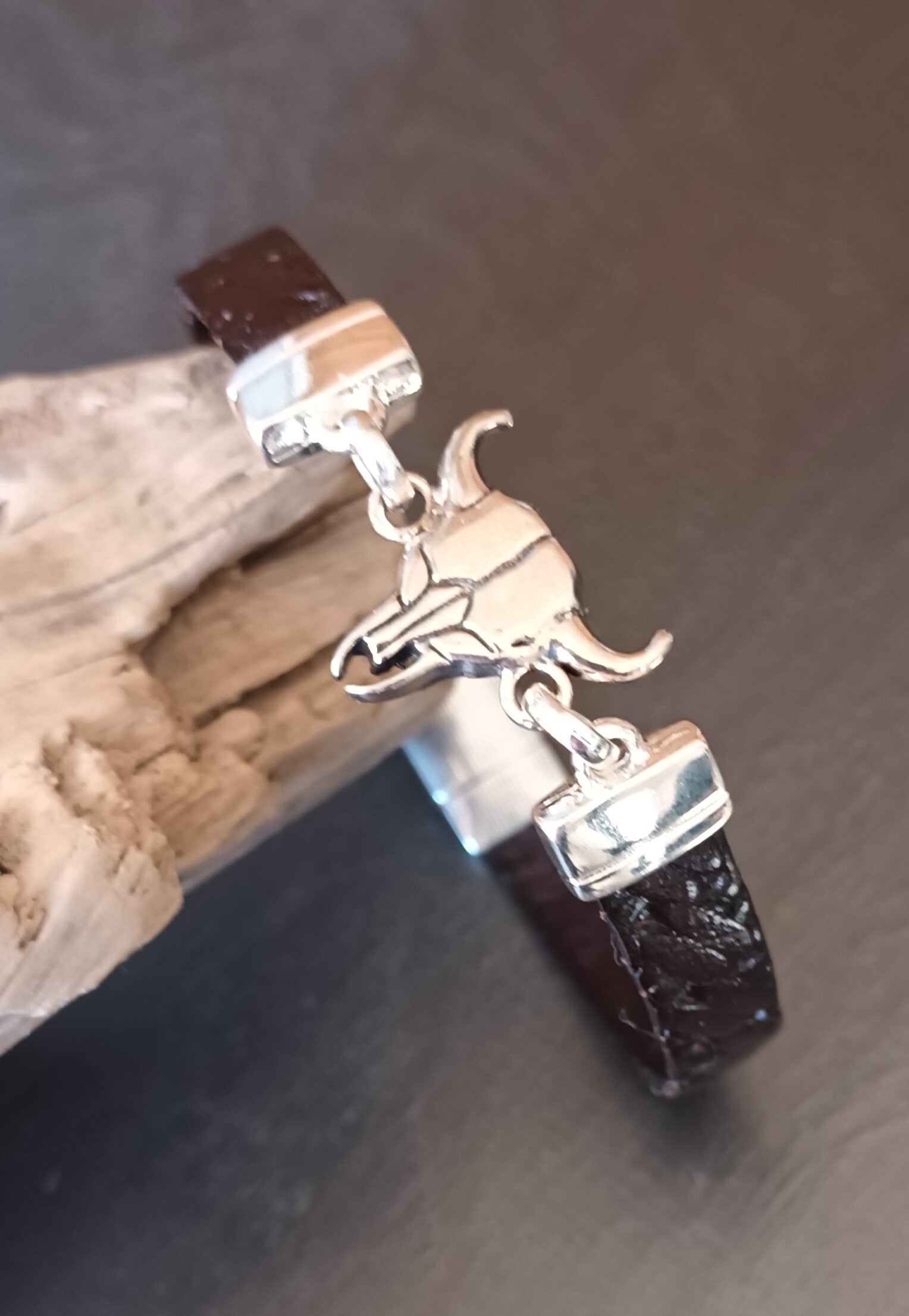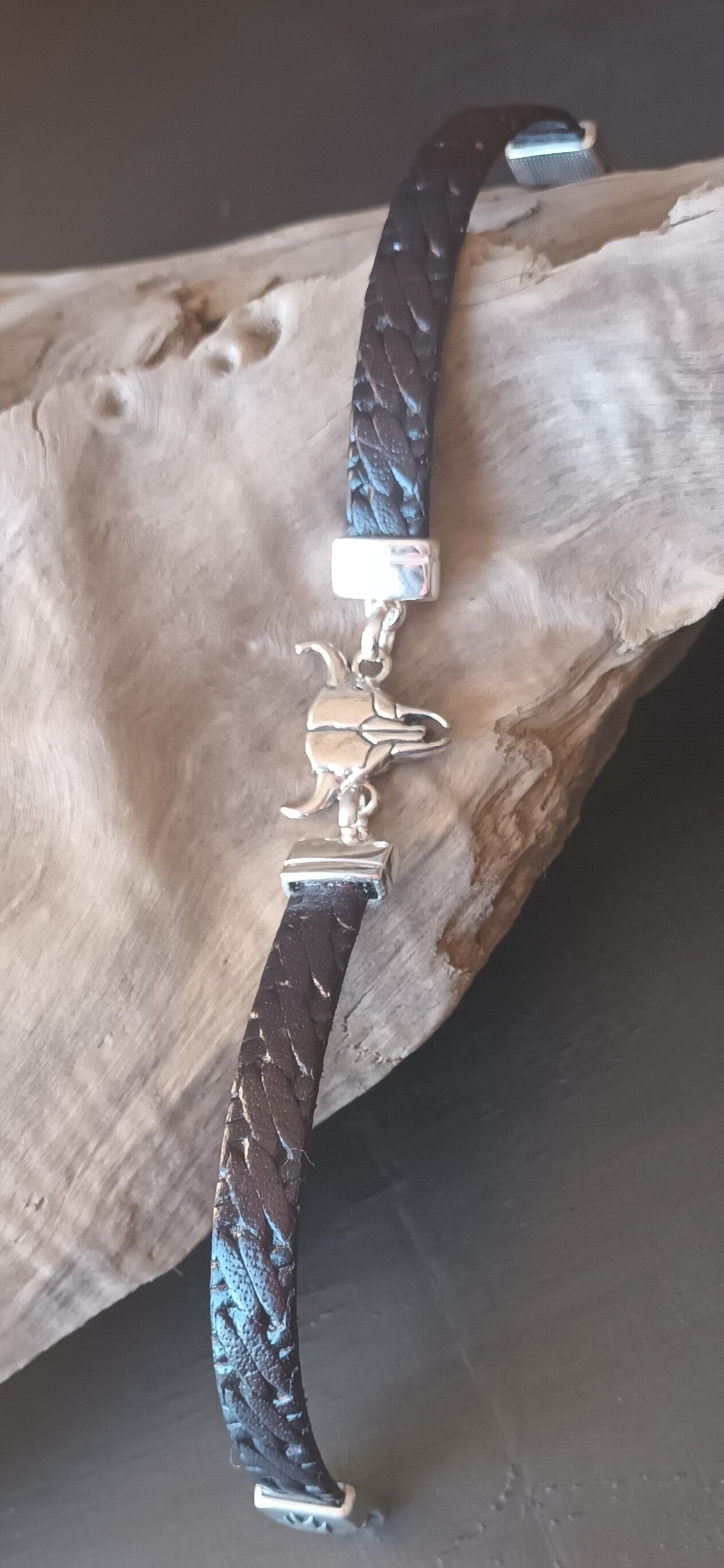 Bracelet cuir point couture marron foncé modèle Crâne de taureau