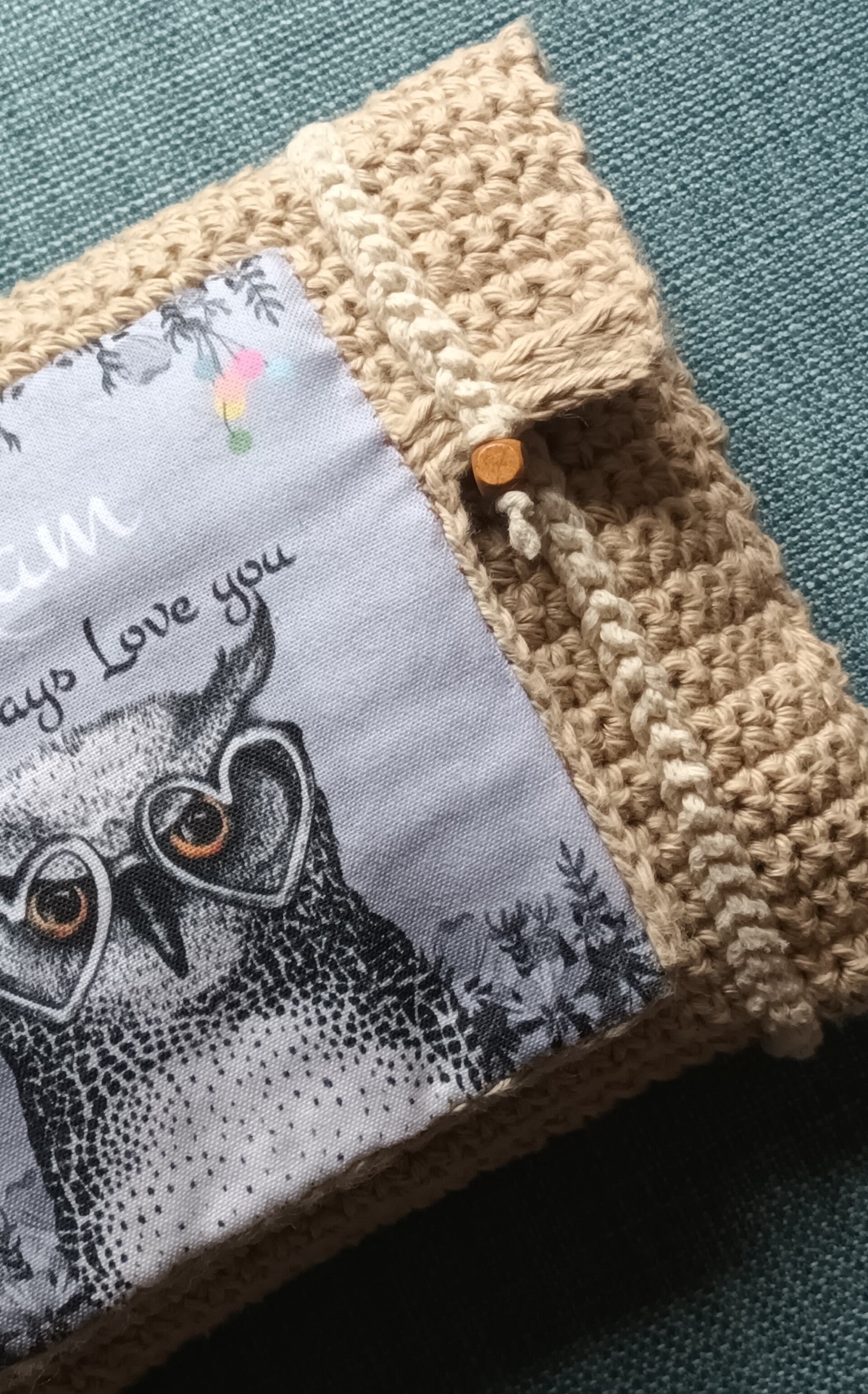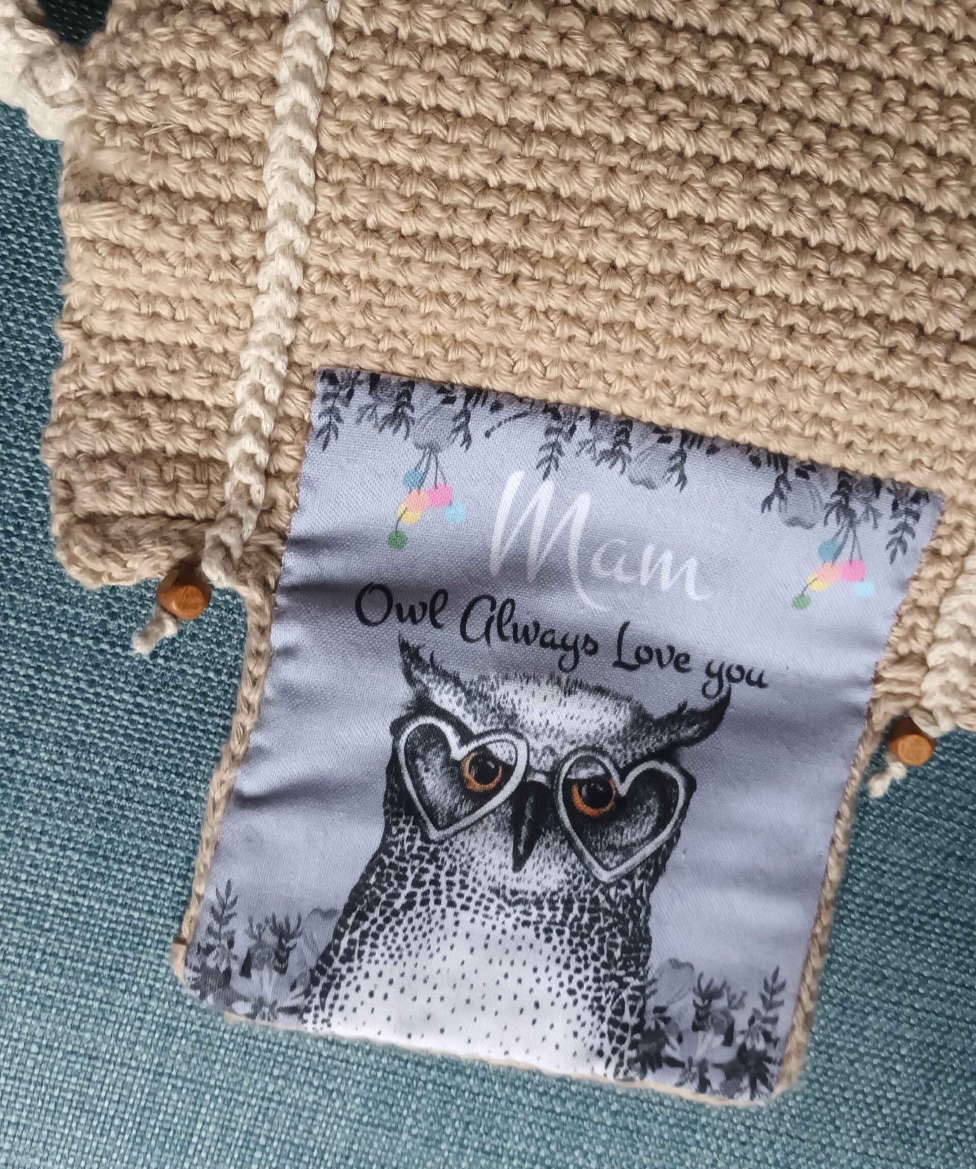 Rabat décoré d'un carré en coton, impression Hibou avec message: "MAM Owl Always Love you". Fermeture par pressions.