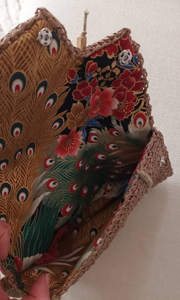 Intérieur doublé d'un tissus de fabrication japonaise. Magnifique imprimé plume de paon et fleurs aux reflets or sur fond noir.